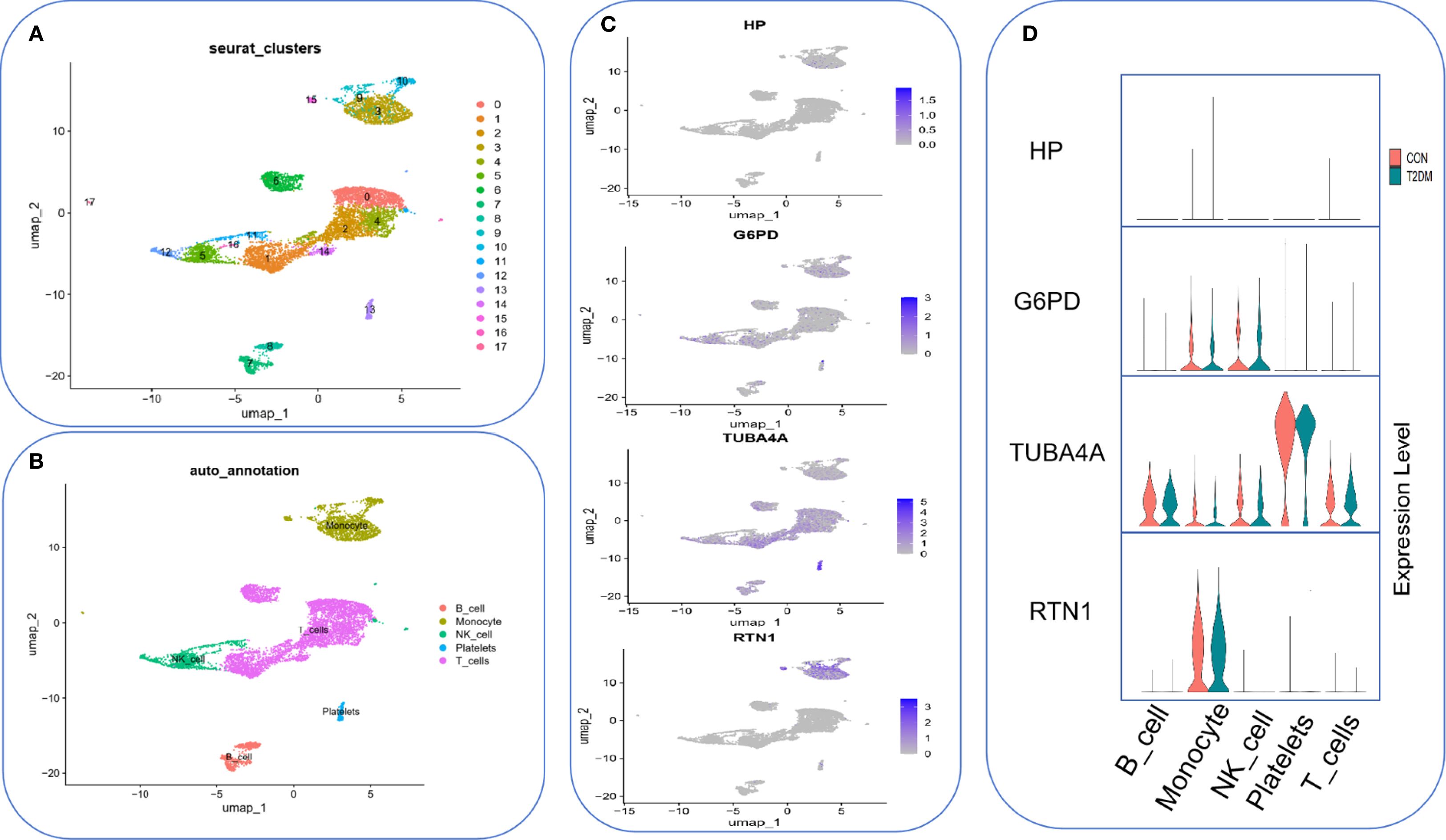 Quality control was first performed on four samples from the T2DM dataset (GSE280401) and the Seurat standard pipeline to classify all cells into 18 subpopulations (Figure 12A). Cell type annotation was performed using SingleR (v1.6.1), and five major cell types were identified: monocytes, NK cells, platelets, B cells, and T cells (Figure 12B). Cell-type-specific expression analysis of the core genes demonstrated that G6PD is specifically expressed in monocytes and NK cells, TUBA4A exhibits a broad expression profile but is significantly elevated in platelets, and RTN1 is primarily expressed in monocytes (Figures 12C, D).