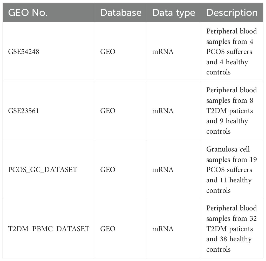 Microarray datasets for PCOS and T2DM were retrieved from the Gene Expression Omnibus (GEO) database (http://www.ncbi.nlm.nih.gov/geo) via the “GEOquery” R package (version 2.26.1) (20). The GSE54248 dataset comprises total RNA extracted from peripheral blood samples of four patients with PCOS and four healthy controls. For T2DM, the GSE23561 dataset, containing peripheral blood samples from nine healthy individuals and eight patients with T2DM, was selected for analysis. Furthermore, to evaluate the diagnostic accuracy of the identified hub genes as biomarkers for PCOS and T2DM, granulosa cell datasets from PCOS patients and peripheral blood datasets from T2DM patients were obtained from the GEO database. Batch effects were removed using “sva” in R 3.52.0, resulting in the construction of two integrated datasets: the PCOS granulosa cell dataset (PCOS_GC_DATASET), comprising GSE106724, GSE114419, and GSE137684 (19 PCOS and 11 control samples); and the T2DM peripheral blood mononuclear cell dataset (T2DM_PBMC_DATASET), comprising GSE156993, GSE15932, and GSE9006 (32 T2DM and 38 control samples) (Table 1). The integrated GEO datasets were subsequently standardized and normalized using “limma” in R 3.60.2 (21), and probe annotation was performed. Principal component analysis (PCA) was conducted both before and after batch effect removal to assess the effectiveness of the adjustment.
