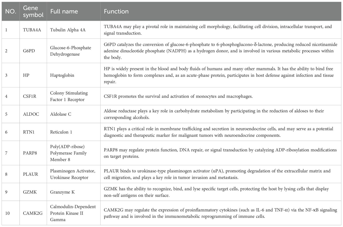 To explore the PPI relationships among the 15 proteins, the genes were uploaded to STRING to construct a PPI network (Figure 5B). The network included 11 nodes and 15 interaction pairs, which were subsequently visualized using Cytoscape (Figure 5C). Hub ARDEGs were pinpointed via the CytoHubba plugin, revealing 10 hub genes, including the downregulated gene GZMK, and the upregulated genes TUBA4A, G6PD, HP, CSF1R, ALDOC, RTN1, PARP8, PLAUR, and CAMK2G (Table 2). These hub genes are associated with immune cell function, glycolysis, and nucleotide phosphorylation and participate in various metabolic processes. Furthermore, CSF1R, TUBA4A, and PLAUR are implicated in apoptosis, migration, and adhesion.