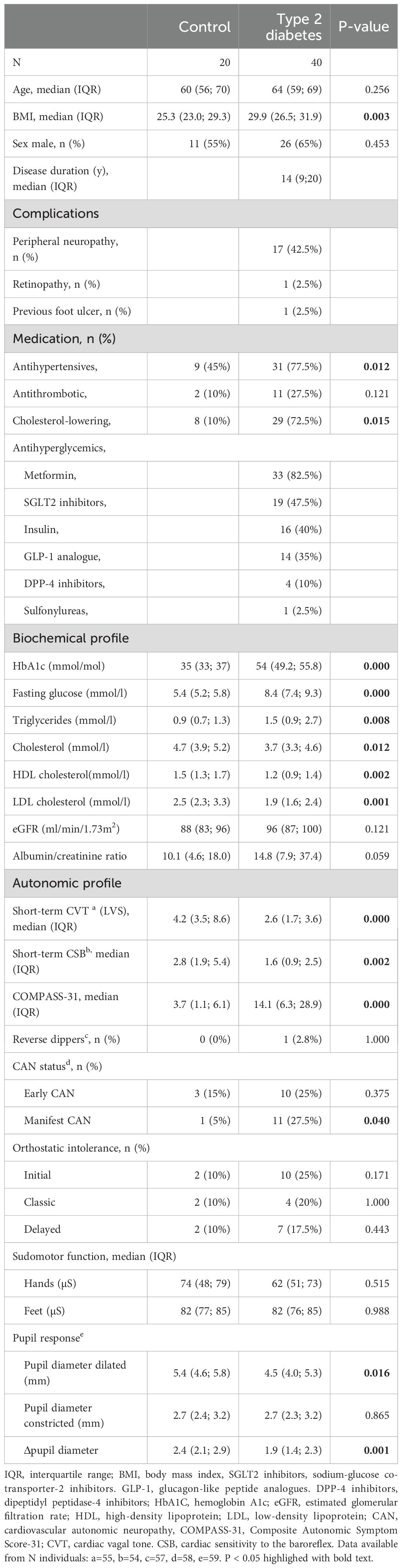 Table 1 lists the clinical characteristics of the study population. In general, the individuals with T2D had higher BMI, and both antihypertensive and cholesterol-lowering medications were more frequently used. Regarding the biochemical profile, individuals with T2D had higher HbA1C and fasting glucose levels than the controls. However, the individuals with T2D had lower, cholesterol, high-density lipoprotein cholesterol, and low-density lipoprotein cholesterol levels, indicating routine treatment of risk factors according to national guidelines. However, they had higher triglyceride levels, likely related to metabolic syndrome. No major differences were observed in kidney function, but the albumin/creatinine ratio was slightly elevated in the individuals with T2D. In terms of the autonomic profile, manifest CAN was more common in individuals with T2D, and they presented with higher COMPASS-31 scores, lower CVT, lower cardiac sensitivity to the baroreflex (CSB), and had smaller pupil diameter when dilated, all signs of a dysregulated autonomic nervous system.
