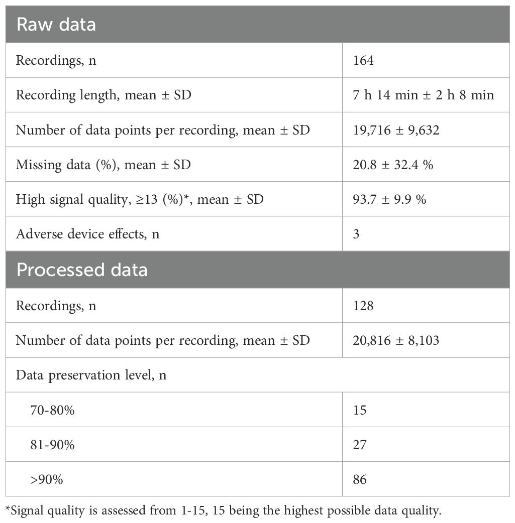 Characteristics of the raw data recorded with the ProCVT smart-sheet are presented as the number of data points, the amount of missing data, the signal quality rated from 0-15 (the higher, the better), and the number of adverse device effects. Missing data was calculated based on the average heart rate. If the heart rate is ≥60 beats per minute (bpm), it was assumed that a recording would have at least one R-peak per second. If the heart rate is <60 bpm, the expected number of observations is calculated using the mean heart rate, as the assumption of one observation per second no longer applies. This approach avoided unnecessary complexity for HR ≥60 bpm, where the assumption of one R-peak per second is sufficiently accurate, while ensuring an appropriate adjustment for lower HR values, where missed beats could otherwise lead to data misinterpretation.
