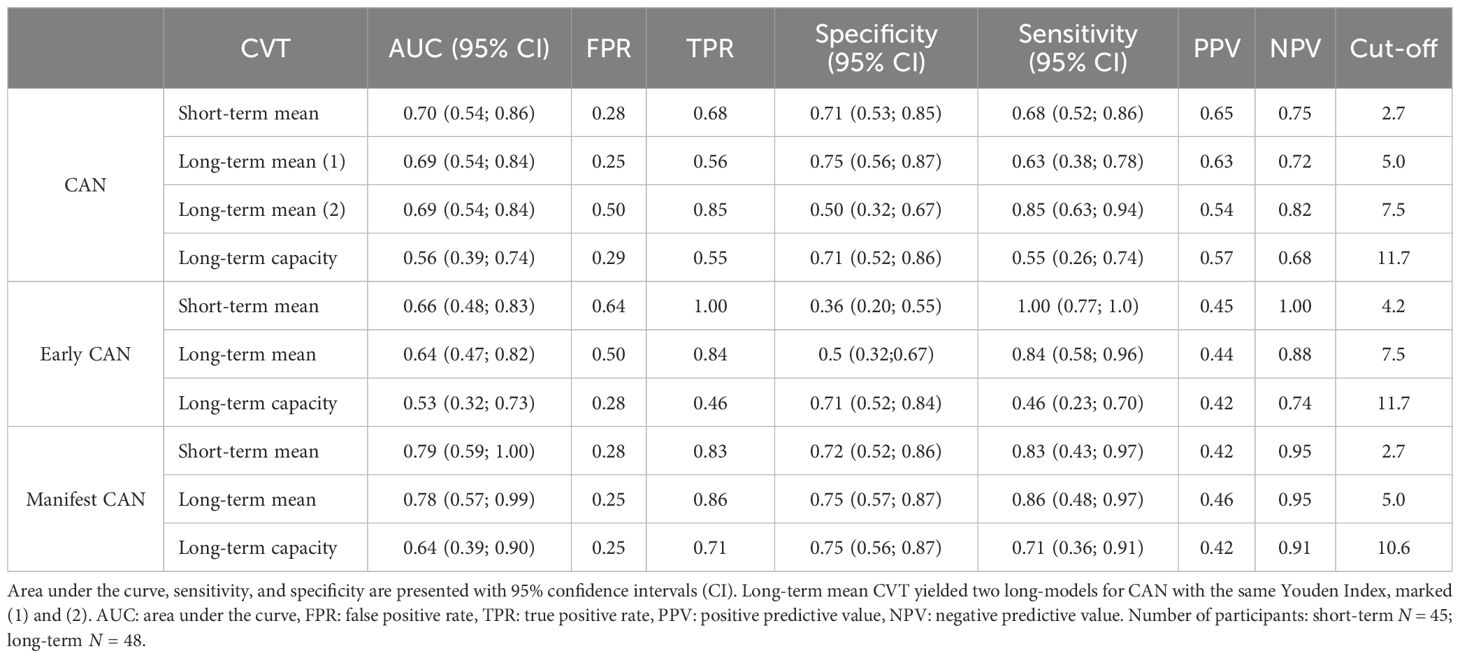 This study investigated the ability of different CVT parameters to distinguish various degrees of CAN. Short-term and long-term mean CVT showed the strongest performance for detecting both the degree of CAN and manifest CAN, with AUCs ranging from 0.64-0.79, balanced sensitivity and specificity, and high negative predictive values – an important feature for screening. For manifest CAN, optimal cut-off points were 2.7 LVS (short-term) and 5.0 LVS (long-term), aligning with Wegeberg et al., 2020, who proposed a short-term threshold of 3.2 LVS in type 1 diabetes based on 5-minute recordings. For early CAN, this study found cut-offs of 4.2 (short-term) and 7.5 (long-term), close to Wegeberg et al.’s 5.2 (17). While we could not confirm CVT’s utility in detecting early CAN, the similar thresholds suggest comparable underlying pathophysiology in both cohorts. Furthermore, the higher long-term cut-point likely reflects increased parasympathetic activity during sleep in a home environment, consistent with known day-night differences in HRV (38). Moreover, a disadvantage of the 5-minute recording is that the CVT may be influenced by the surrounding area, and the patient may be less comfortable in clinical setting which could result in a lower CVT. Whereas the ProCVT smart-sheet can provide a more reliable estimate of the patient’s parasympathetic capacity due to the home element. Additionally, the technology used in the 5-minute recording does not offer real-time recording, requiring uploading and processing, and the processing takes the same amount of time whether the recording is five minutes or eight hours long. The ProCVT smart-sheet, however, automatically uploads data and has the potential for implementing automatic processing, reducing clinical workload and improving feasibility. The ProCVT smart-sheet also supports real-time recording, making it suitable not only for long-term monitoring but also for short-term recordings.