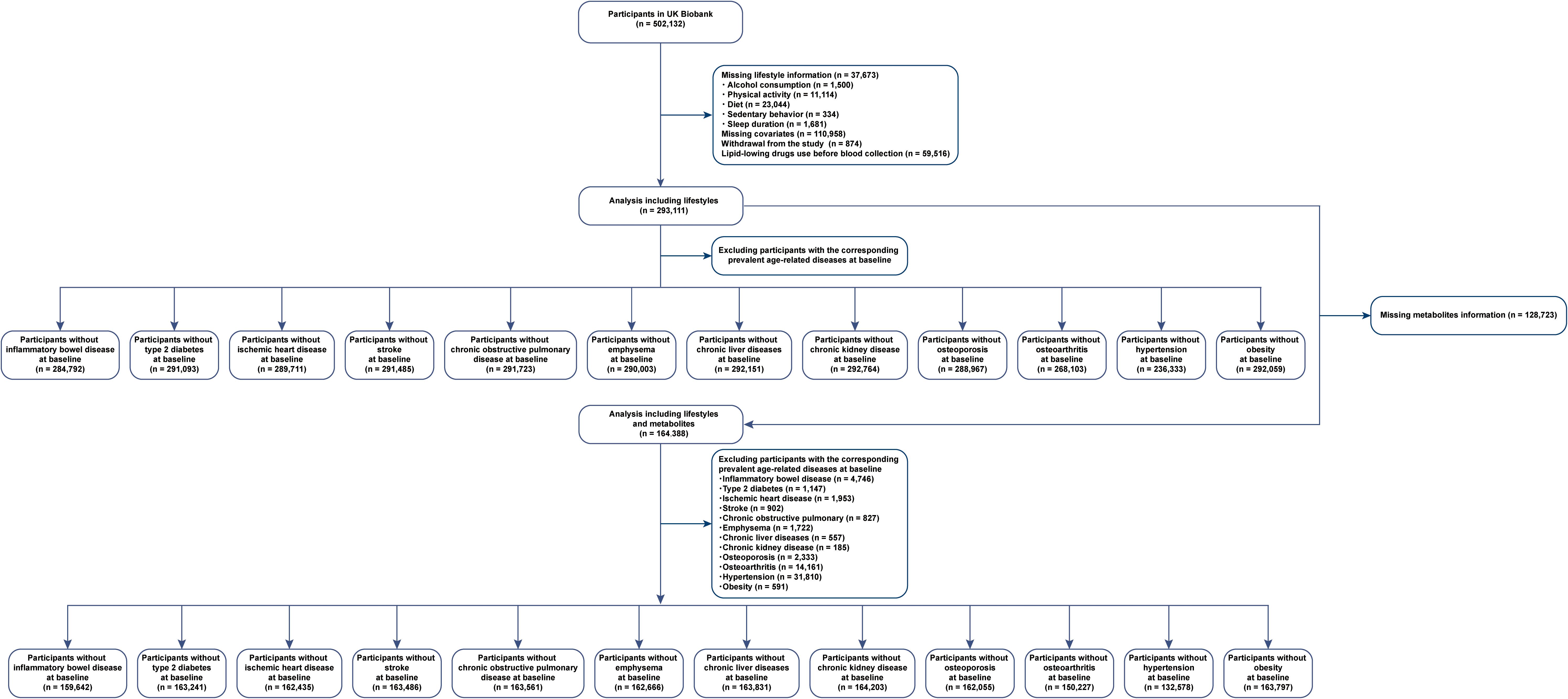 Flowchart illustrating the participant selection process from the UK Biobank, starting with 502,132 participants. Exclusions are based on missing lifestyle information, withdrawal, and lifestyle factor analysis, reducing to 293,111 participants. Further exclusions are made for age-related diseases, leaving 164,388 participants for the final analysis. Categories include participants without specific diseases like inflammatory bowel disease, type 2 diabetes, ischemic heart disease, and others, with each category showing the respective number of participants. Missing metabolites information affects 128,723 participants.