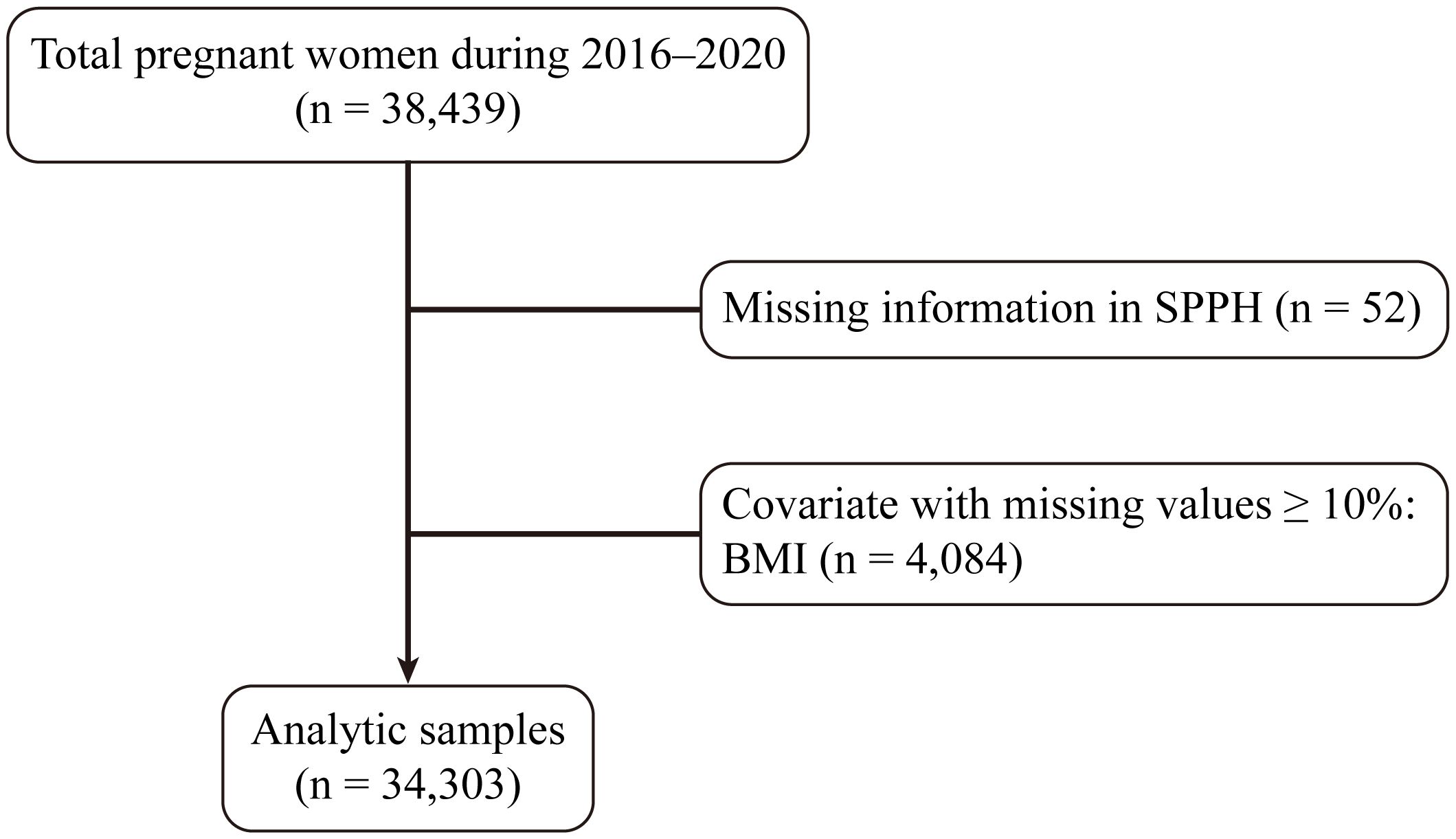 Ethical approval (approval number: [2024] 142) was obtained for this analysis and each participant signed informed consent. This study examined the institutional database encompassing all women who gave birth at the Third Affiliated Hospital of Guangzhou Medical University (Guangzhou Medical Centre for Critical Pregnant Women) from January 2016 to December 2020. In total, 38,439 women were included in the analysis. Women lacking SPPH information (n = 52) were excluded from the analysis. Additionally, pregnancies with missing values comprising ≥ 10% of covariates, such as pregestational body mass index (BMI) (n = 4,084), were removed. Subsequently, missing values for covariates comprising < 10% were imputed using the random forest method. Thus, our final analysis included a total of 34,303 pregnant women (Figure 1).