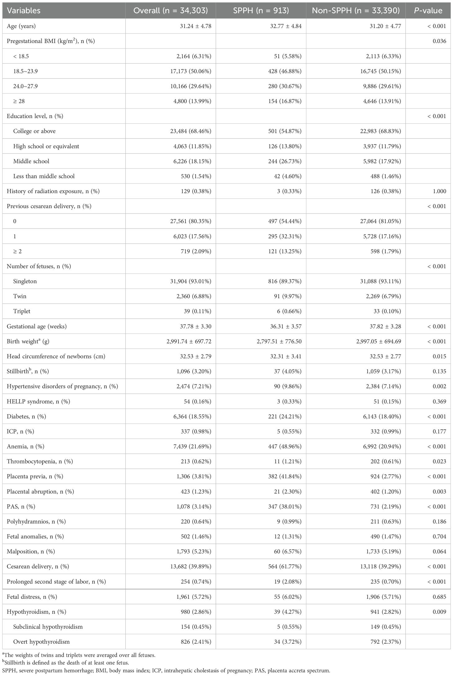 The baseline characteristics of the study population are shown in Table 1. In our analysis, we included 34,303 pregnant women, among whom 913 were diagnosed with SPPH, and the average age of the participants with SPPH was 32.77 ± 4.84 years. Overweight women (pregestational BMI exceeding 23.9) were more frequently observed in the SPPH group. Low educational level, history of radiation exposure, and previous cesarean delivery were more common among pregnant women with SPPH. Furthermore, the SPPH group exhibited higher rates of hypertensive disorders of pregnancy, diabetes, anemia, thrombocytopenia, placenta previa, placental abruption, PAS, cesarean delivery, prolonged second stage of labor, and hypothyroidism. Baseline characteristics stratified by thyroid status are provided in Supplementary Table 4.
