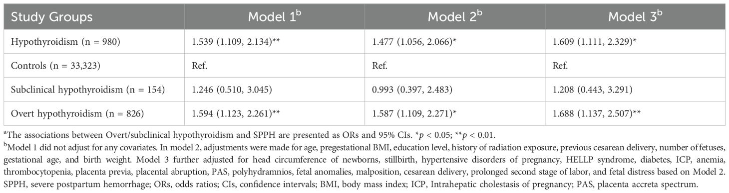 Table 2. Association between overt/subclinical hypothyroidism and SPPH by logistic modelsa.