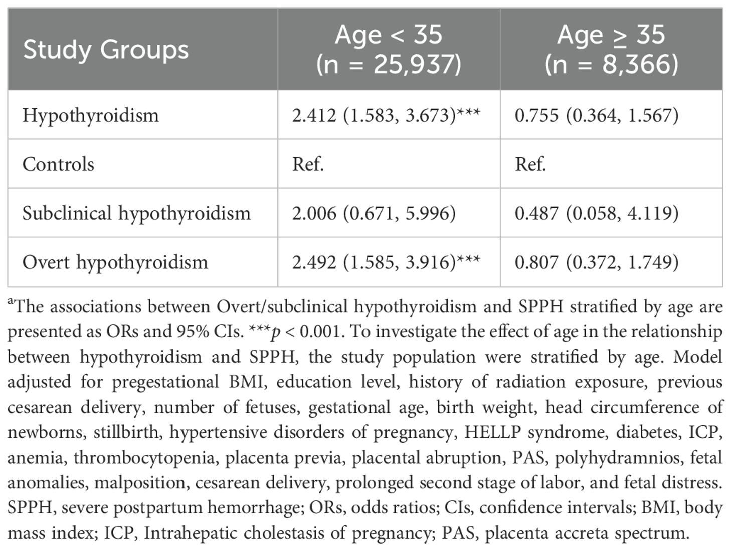 Similar to a recent study of a population database including over 184000 women with hypothyroidism (5), we found that hypothyroidism is associated with an increased risk of SPPH. In a study of 702 pregnant women in Pakistan, it was found that PPH was the most common maternal outcome in pregnant women with hypothyroidism (11). However, none of these studies differentiated between overt or subclinical hypothyroidism. Nazarpour et al. found that overt hypothyroidism was associated with an increased incidence of adverse pregnancy outcomes, including PPH, while there is no consensus on subclinical hypothyroidism (33). In this retrospective cohort study of 38439 women from the Third Affiliated Hospital of Guangzhou Medical University, we observed that overt hypothyroidism was an important factor contributing to the elevated risk of SPPH, but subclinical hypothyroidism did not show a significant effect on the development of SPPH. However, Medenica et al. suggest that subclinical hypothyroidism may cause PPH (34). Additionally, treatment of pregnant women with subclinical hypothyroidism using LT4 can significantly reduce the incidence of adverse pregnancy outcomes (35), especially PPH (36). One possible explanation for this discrepancy is the small number of SPPH events among women with subclinical hypothyroidism in our cohort, which may have limited the statistical power to detect a true association. Therefore, for subclinical hypothyroidism, the absence of a significant association in our study should be interpreted with caution rather than as evidence of no risk. Some studies have shown that advanced maternal age is associated with an increased risk of PPH (37, 38). Additionally, Cai et al. found that maternal age ≥ 30 years was related to adverse pregnancy outcomes in pregnant women with hypothyroidism (39). In our study, we observed an age-stratified pattern in the association between hypothyroidism and SPPH. Among participants younger than 35 years, hypothyroidism was identified as a significant risk factor for SPPH. However, for those aged 35 years and older, no significant association was detected. Further examination of the raw data revealed that, within the ≥ 35 years group (n = 8,366), the number of SPPH events among women with overt hypothyroidism (n = 9) and subclinical hypothyroidism (n = 1) was small, which likely limited the statistical power to detect a true association. Thus, the lack of significance in this subgroup should be interpreted with caution.