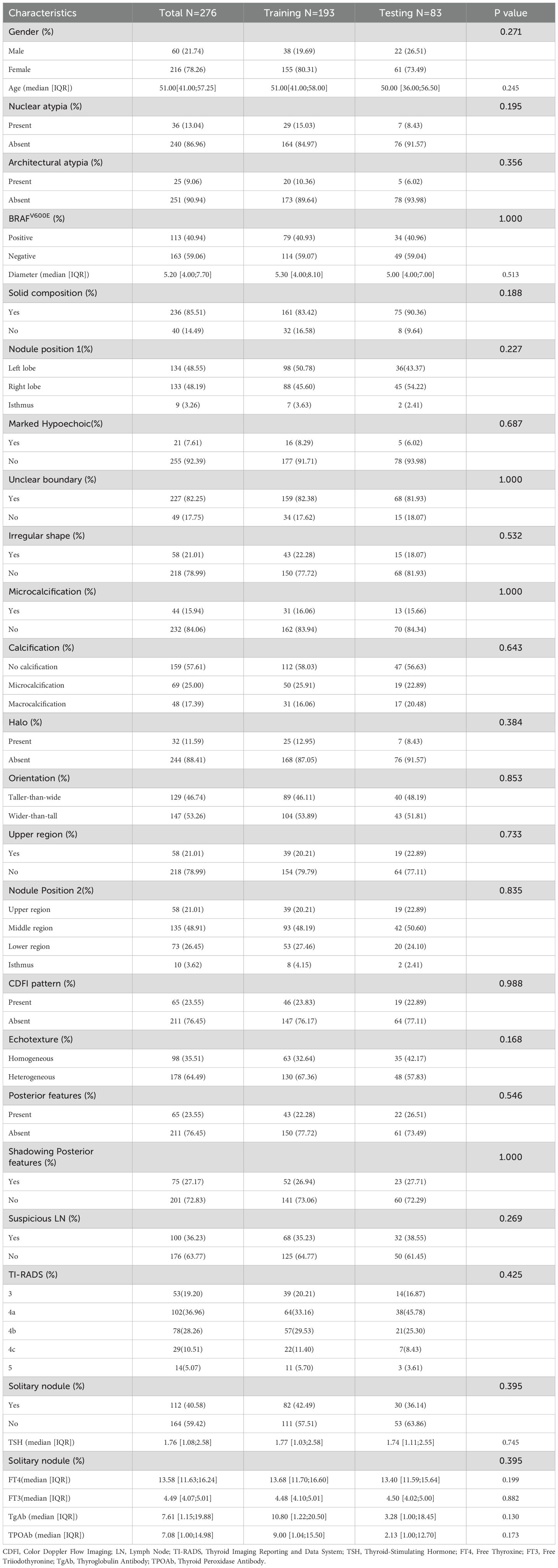 Between January 2020 and June 2024, 7,371 patients underwent ultrasound-guided fine needle aspiration, while 2,761 patients underwent thyroidectomy. Among the thyroid nodules assessed by US-FNA, 10.2% (754/7,398) were diagnosed with Bethesda III nodules. Of these Bethesda III nodules, 31.6% (238/754) underwent surgical resection, 7.3% (55/754) underwent repeat biopsies, and 6.9% (52/754) were subjected to 12-gene panel testing. Notably, 36.4% (20/55) of the Bethesda III nodules that underwent repeat biopsies had indeterminate results. A total of 69 patients were excluded due to incomplete records (16), other pathologically confirmed thyroid cancer types (2), uncertain repeat biopsy outcomes (20), mutations found by 12-gene panel testing (1), or insufficient follow-up for at least six months after repeat biopsy or 12-gene panel testing (30). Consequently, the current study included 271 patients: 213 females and 58 males, with a total of 276 Bethesda III nodules. Approximately 65.2% (180/276) of the nodules were malignant, while 34.8% (96/276) were benign. BRAF mutations were detected in 41% (113/276) of the cases. In our dataset, only 36 cases (13.04%) were classified as AUS and 25 (9.06%) as FLUS. Neither AUS nor FLUS showed statistical significance in the univariate analysis. The median age of patients was 51 years (IQR 41.00–57.25), and the median nodule size was 5.2 mm (IQR 4.00–7.70). In the current dataset, five variables were missing, all related to thyroid function tests, resulting in 232 missing values, or approximately 2.8% of the total data points. These missing values were distributed among multiple variables, as detailed in Supplementary Table S1 and Supplementary Figure S2. The cohort was randomly divided into a training set (n = 193) and a validation set (n = 83). As shown in Table 1, no significant differences were observed in the baseline characteristics between the two groups (P > 0.05).