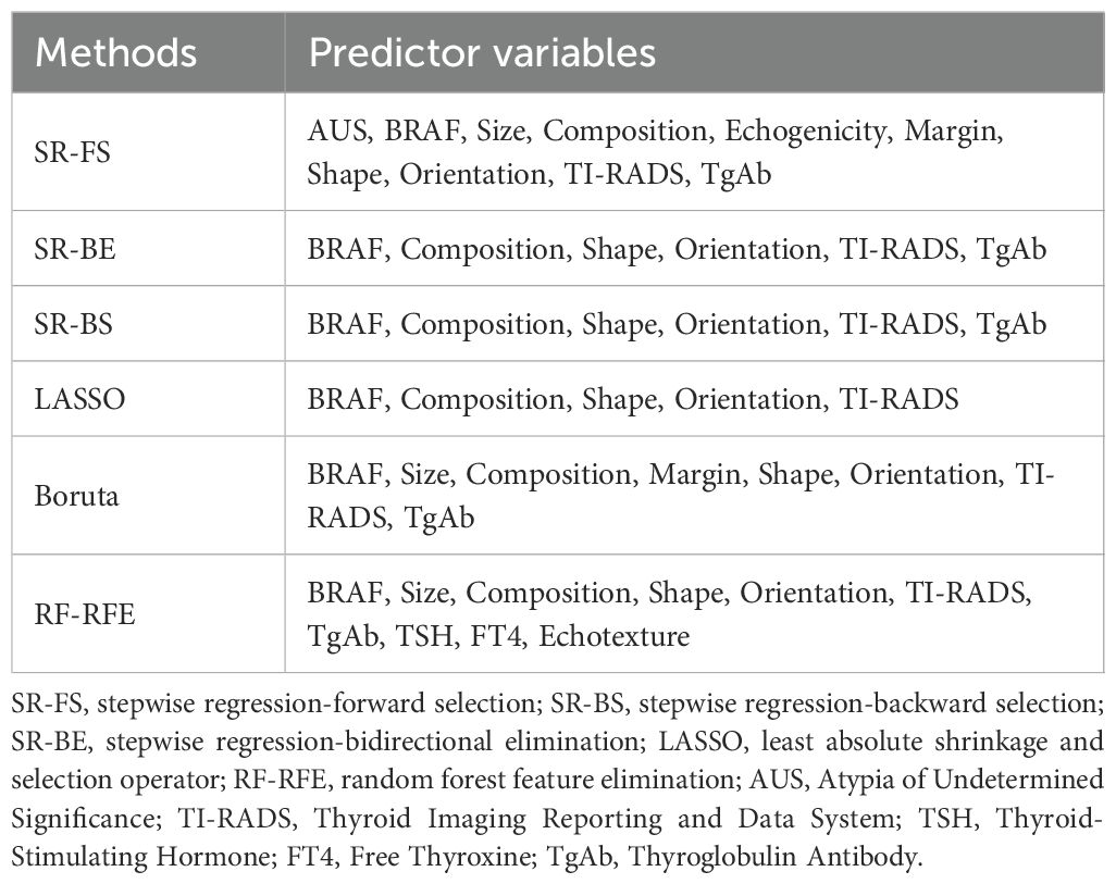Table 2. Predictor variables of Bethesda III nodules using different selection methods.