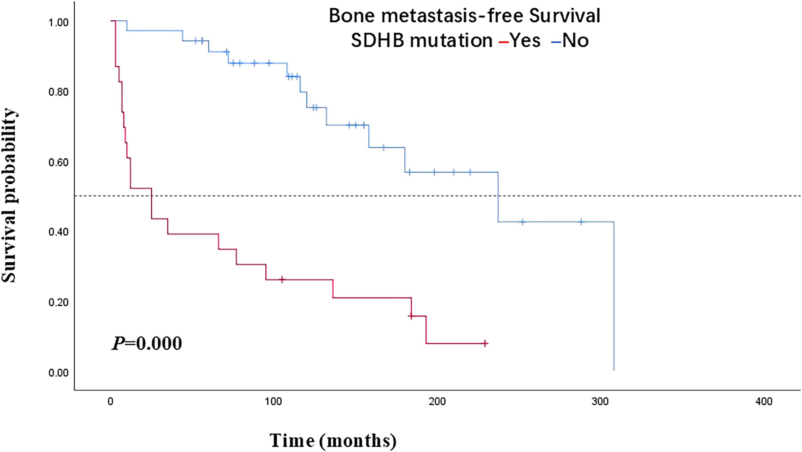 Kaplan-Meier survival curve showing bone metastasis-free survival in patients with and without SDHB mutation. The red line represents patients with the mutation, while the blue line represents those without. The survival probability is on the y-axis, and time in months is on the x-axis. The log-rank test results are significant with P equals 0.000.