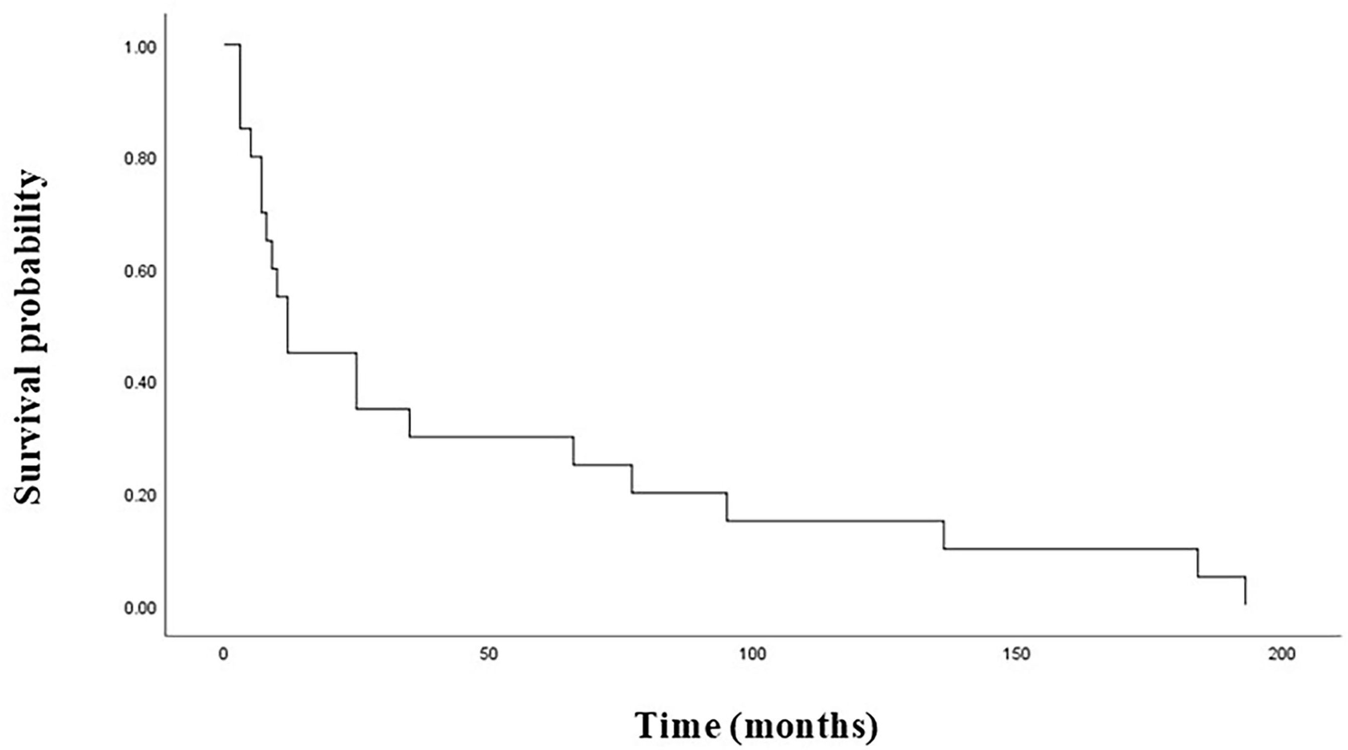 Kaplan-Meier survival curve showing decreasing survival probability over time, measured in months. The curve steps down at intervals, reaching zero survival probability slightly after two hundred months.