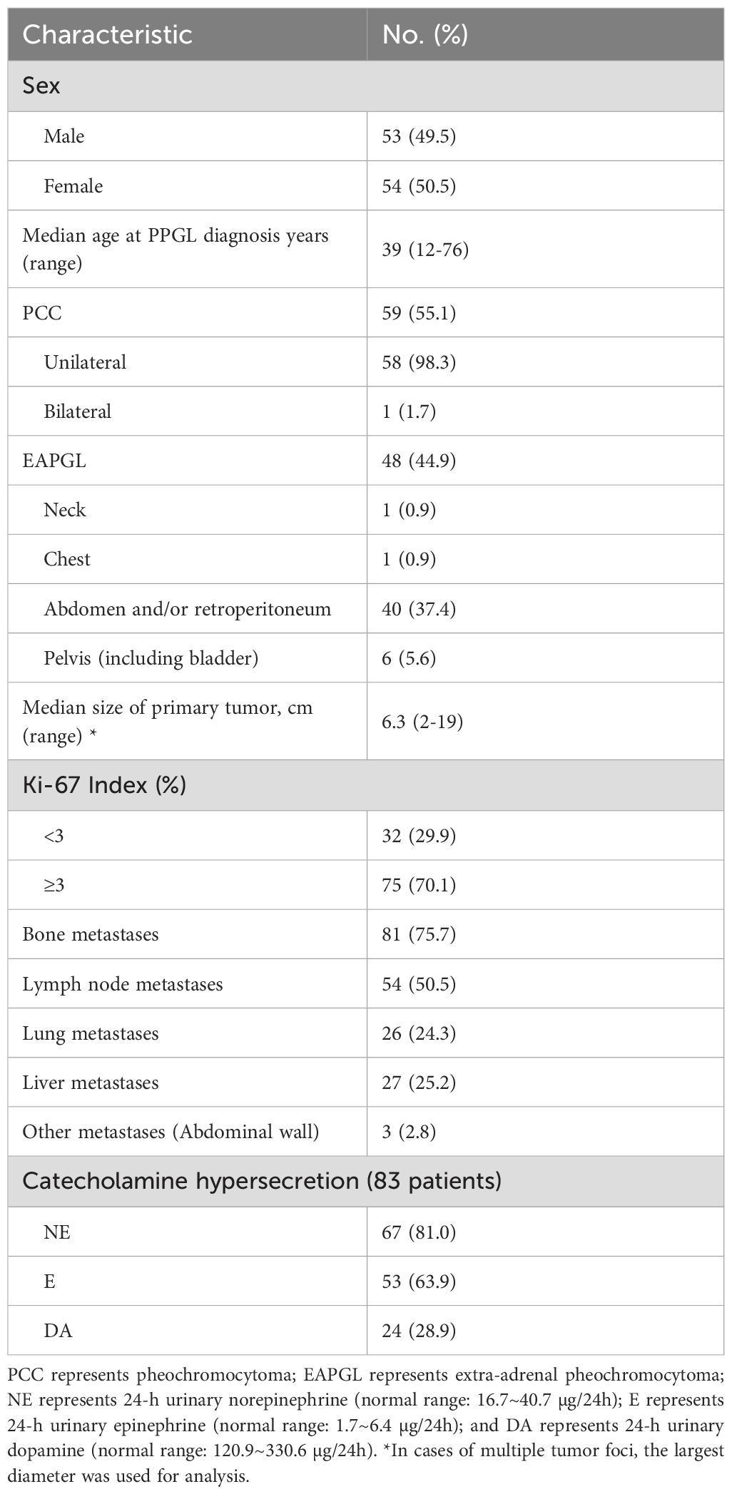 In this study, the median age at diagnosis among the 107 patients with PPGLs was 39 years (range, 12–76 years), with 53 (49.5%) males and 54 (50.5%) females. Among the tumors, 59 (55.1%) were PCCs, and 48 (44.9%) were extra-adrenal paragangliomas (EAPGLs); most of the tumors occurred in the unilateral adrenal and retroperitoneum. Among the 107 patients, all metastases were identified during postoperative follow-up. The most frequent site was bone (81 patients, 75.7%), followed by lymph node (54, 50.5%), liver (27, 25.2%), and lung (26, 24.3%). Postoperative pathology results indicated that the median primary tumor size of the 107 PPGLs was 6.3cm (range, 2~19 cm), 75 (70.1%) of which had a Ki-67 index of 3% or greater. Eighty-three of the 107 patients (77.6%) reported 24-h urinary catecholamine hypersecretion, of which NE was the most frequent hormone (67 patients [81.0%]) (Table 1).
