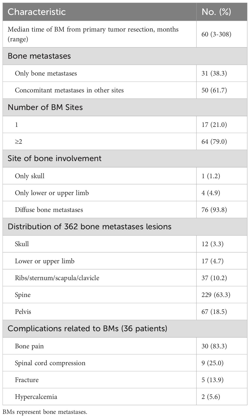 Among the 81 PPGL patients with bone-metastasis, metastatic disease was limited to bone in 31 patients (38.3%), whereas 27 (33.3%), 19 (23.5%) and 23 (28.4%) patients had concomitant metastases in the lymph node, liver and lung, respectively. Among the 81 PPGL patients, 17 (21.0%) had a single BM, while 64 (79.0%) had multiple (≥ 2 sites) BMs. In terms of the site of the BMs, 1 patient (1.2%) had only skull, 4 (4.9%) had only limbs, and 76 (93.8%) had diffuse bone metastases. At the time of the BM diagnosis, 69 of the 81 patients for whom data were available had a total of 362 bone metastasis lesions, 12 (3.3%) in the skull, and 17 (4.7%) in the limbs. Most (333 lesions [92.0%]) bone lesions were in the ribs, sternum, spine, pelvis, scapula and clavicle, 229 of which (63.3%) were in the spine. Thirty-six of the 81 (44.4%) patients developed skeletal complications, 30 (83.3%) patients reported pain owing to BMs, 9 (25.0%) patients had spinal cord compression, 5 (13.9%) patients had pathological fractures, and 2 (5.6%) patients had hypercalcemia (Table 3).