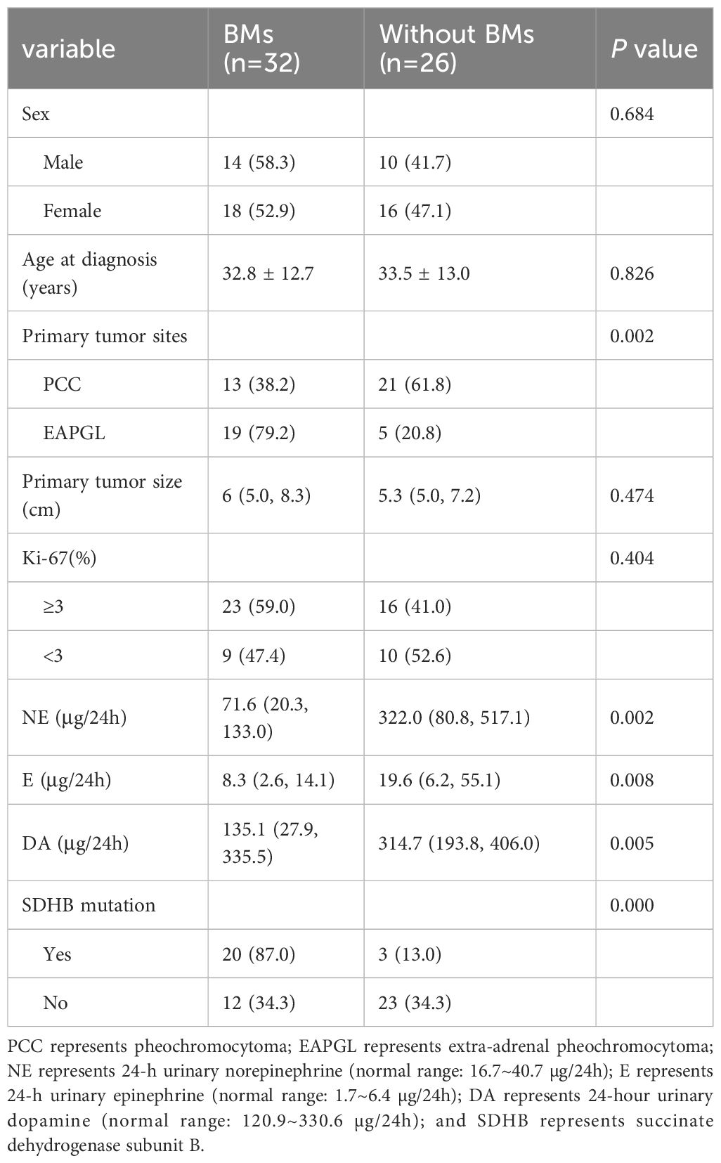 Table 5. Comparison of the clinical characteristics of 58 PPGL patients with or without bone metastasis.