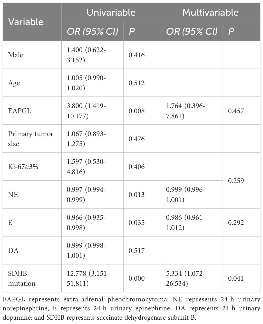 Logistic regression analysis was used to identify risk factors for BM in PPGLs. Univariable analysis revealed that EAPGL (OR, 3.800 [95% CI, 1.419–10.177]; P=0.008), lower 24h U-NE concentrations (OR, 0.997 [95% CI, 0.994–0.999]; P=0.013), lower 24h U-E concentrations (OR, 0.966 [95% CI, 0.935–0.998]; P=0.035), and SDHB mutation (OR, 12.778 [95% CI, 3.151–51.811]; P=0.000) were risk factors. Multivariate logistic regression analysis revealed that SDHB mutation (OR, 5.334 [95% CI, 1.072–26.534]; P=0.041) was an independent risk factor for BM in PPGLs (Table 6).