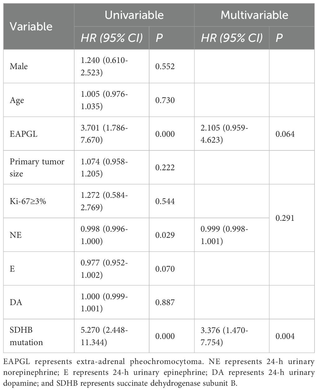 At the last follow-up examination, 5 of the 107 patients (4.7%) had died, and the median OS was not reached. Eighty-one of the 107 patients were diagnosed with postoperative BMs, and the median BMFS was 108 months (range, 3–308 months). Univariable analysis revealed that the factors significantly associated with shorter bone metastasis-free survival were EAPGL (HR, 3.701 [95% CI, 1.786–7.670]; P =0.000), lower 24h U-NE concentrations (HR, 0.998 [95% CI, 0.996–1.000]; P =0.029), and SDHB mutation (HR, 5.270 [95% CI, 0.190–0.088]; P =0.000). Multivariate Cox proportional hazards regression analysis revealed that SDHB mutation (HR, 3.376 [95% CI, 1.470–7.754]; P =0.004) played an independent prognostic role (Table 7).