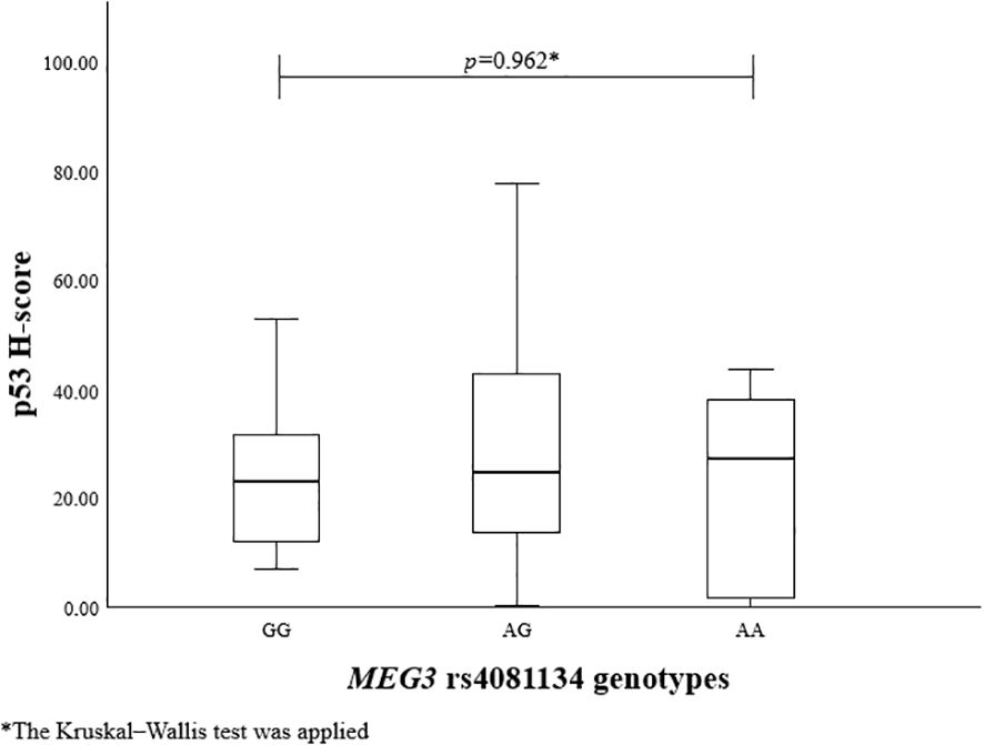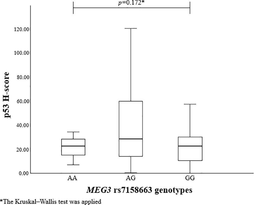 To evaluate the association between MEG3 rs4081134 and rs7158663 variants and p53, the p53 H-score was calculated in different genotype groups. However, no statistically significant differences were observed (Figures 1 and 2).