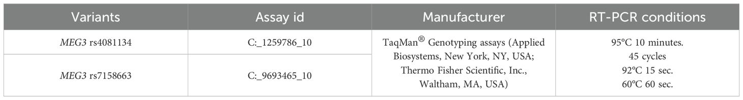Blood from all study participants was collected in vacuum tubes containing ethylenediaminetetraacetate (EDTA) to prevent clot formation. In this study, DNA was isolated from the venous blood of study participants using the leukocyte salt precipitation method. The method was used as described earlier (32). The lncRNA genotypes of the MEG3 rs4081134 and rs7158663 variants were determined by RT-PCR using the StepOne Plus amplifier (Applied Biosystems, USA). The genotypes of selected lncRNA variants were determined according to the protocols of the manufacturer, StepOne Plus (Applied Biosystems). The protocol for determining genotyping conditions and variant characteristics is presented in Table 1.