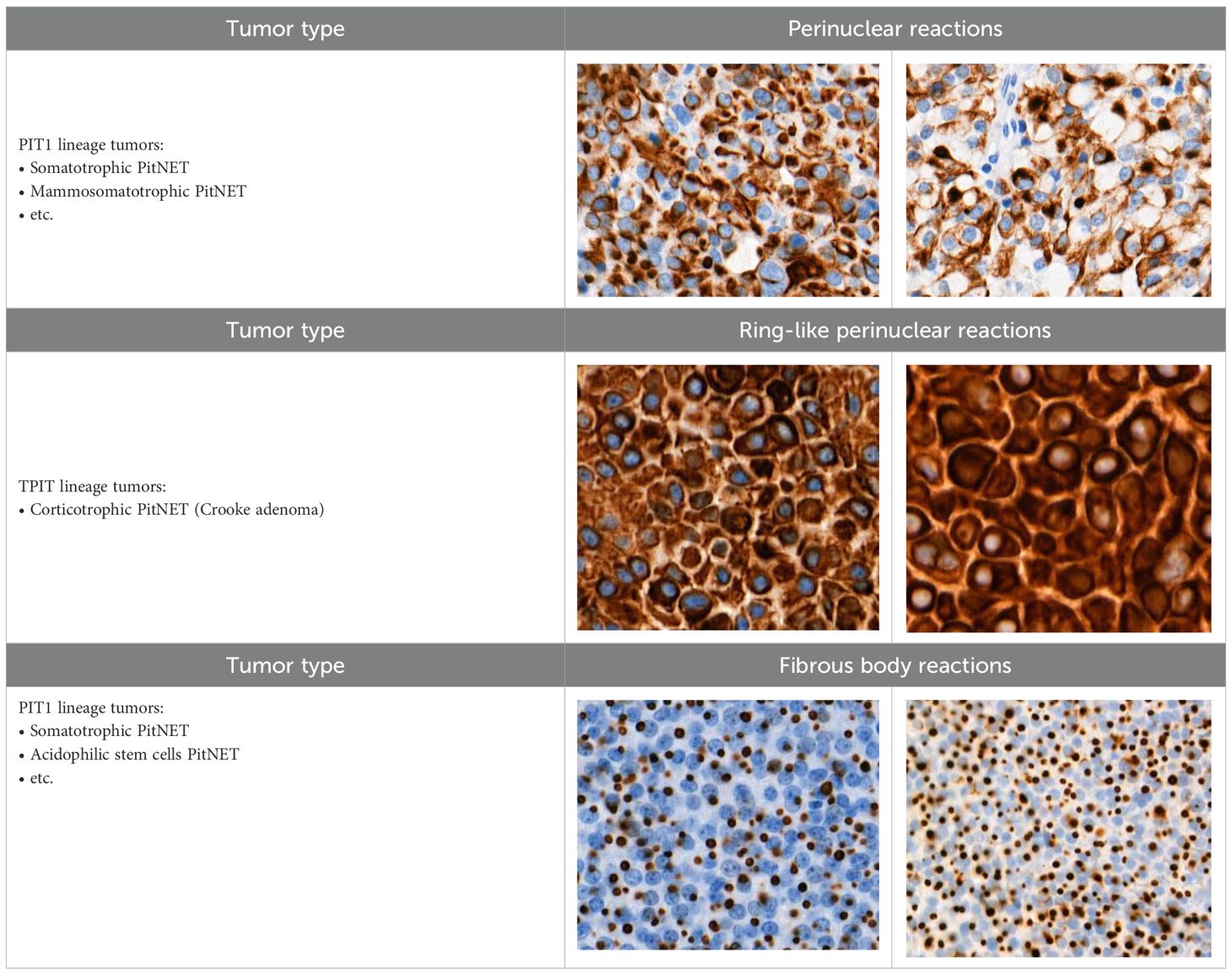 Based on the 2022 World Health Organization (WHO) Classification of Endocrine and Neuroendocrine Tumors, PitNETs are grouped by cellular lineage, which is determined through targeted immunohistochemical reactions. PitNETs of PIT1 lineage includes somatotroph, lactotroph, and thyrotroph adenomas. Furthermore, corticotroph and gonadotroph adenomas and their variants comprise TPIT and SF1 lineages, whereas tumors that lack detectable hormone or transcription factor expression are defined as null-cell adenomas (6, 7). However, to date, no distinctive morphologic criteria and no single prognostic biomarker can predict the likelihood of tumor growth or malignant progression (4, 8, 9).