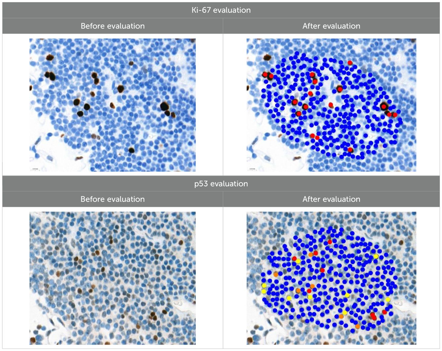 To calculate the percentage of Ki-67-positive (brown/dark brown/black) nuclei, negative nuclei were marked in blue and positive nuclei in red. For p53-positive nuclei, “weakly positive (+)” nuclei were marked in yellow, “moderately positive (++)” in orange, and “strongly positive (+++)” in red.