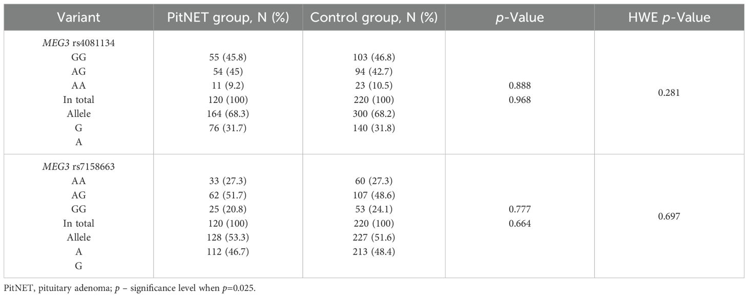 Table 5. MEG3 rs4081134 and rs7158663 genotype and allele frequencies in PitNET and control groups.