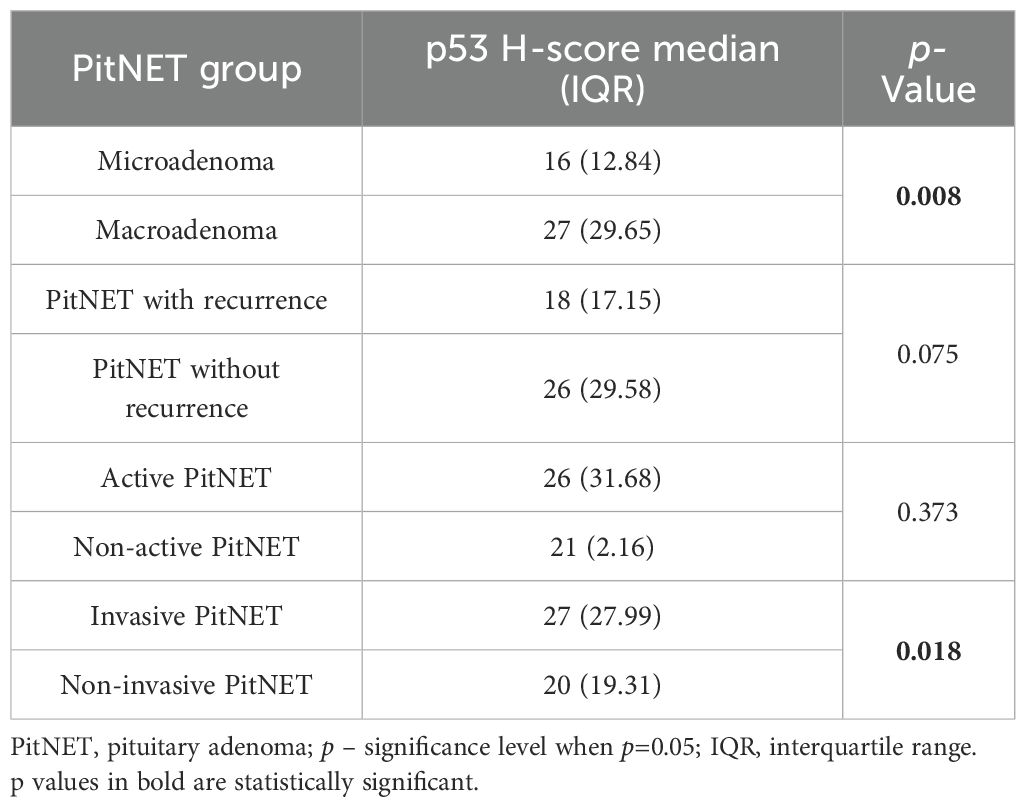 p53 is a transcription factor responsible for modulating various stress-induced antiproliferative pathways. Despite being widely studied in different malignancies, its role in the PitNETs remains unclear (43). Wang et al. revealed that miR-219a-2-3p inhibits PitNET cell proliferation, and promotes apoptosis by modulating the MDM2/p53 axis. Accordingly, miR-219a-2-3p was significantly down-regulated in PitNET cells. However, artificial overexpression of miR-219a-2-3p inhibited PitNET cell proliferation and promoted apoptosis and p53 expression (44). Abnormal p53 expression has also been reported in poorly differentiated neuroendocrine carcinomas (NECs), correlating with aggressive behavior and poorer prognosis, whereas well-differentiated NETs typically retain normal p53 expression (45, 46). In our study, we found that a higher p53 H-score was associated with invasive PitNETs, indicating that elevated p53 expression may contribute to PitNET invasiveness. Additionally, we found that a higher p53 H-score was significantly associated with larger tumor size, showing that increased p53 expression may contribute to clinical symptoms related to tumor compression. These findings suggest that p53 immunohistochemical scoring could serve as a useful tool for risk evaluation in PitNET patients. Incorporating p53 H-score into routine clinical practice may help identify tumors at higher risk of invasiveness and aggressive growth.