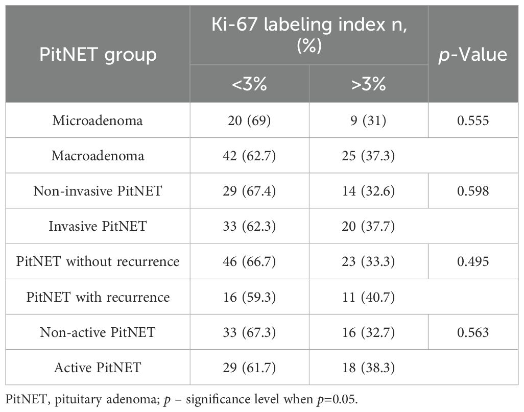 Comparison of the groups with different Ki-67 LI immunohistochemical reactions (<3% and >3%) revealed no statistically significant differences between the clinical PitNET groups (Table 17).
