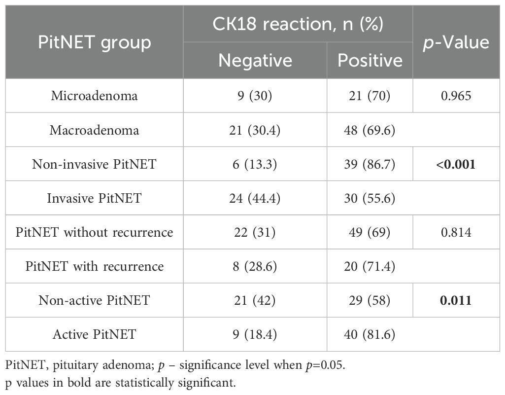 To date, the relationship between CK18 immunostaining patterns and the clinicopathological features of PitNETs has not yet been established. Although, CK18 expression has been extensively studied in various other malignancies, where it is often associated with tumor differentiation, proliferative activity, and overall prognosis. Yang et al. highlighted that elevated serum CK18 levels are associated with poorer breast cancer prognosis, whereas high CK18 tissue expression indicates a better outcome. Additionally, high CK18 expression has been found to be associated with larger tumor size, stage, and grade (47). Shi and co-authors revealed that CK18 expression is suppressed in advanced and metastatic breast tumors. Moreover, CK18 loss was found to activate the NF-κB/Snail axis, leading to the upregulation of breast cancer resistance protein (BCRP) (48). Safadi et al. demonstrated that CK18 expression rises with tumor aggressiveness. Stronger CK18 immunohistochemical staining scores were significantly associated with advanced clinical stage and greater invasion of oral and oropharyngeal squamous cell carcinoma. Besides, elevated CK18 expression showed higher chances of tumor recurrence after surgical resection (49). A study by Yin et al. showed that CK18 expression in prostate cancer inversely correlates with tumor grade. Lower CK18 staining intensity was associated with higher Gleason scores (>7), indicating CK18 downregulation in aggressive prostate tumors (50). In our study, we found that invasive PitNETs are associated with negative CK18 reactions compared to the non-invasive PitNET group, showing that loss of CK18 expression may be related to PitNET tumor aggressiveness. Also, an additional consideration is the heterogeneity of CK18 staining patterns observed in our study, including diffuse, focal, cytoplasmic, perinuclear, fibrous body, and ring-like perinuclear reactions. Such variability may reflect underlying biological differences in tumor architecture or cell stress responses, and future studies are warranted to clarify whether distinct patterns (e.g., fibrous body vs. diffuse) carry prognostic or diagnostic significance. Additionally, we found that functionally inactive PitNETs are more likely to demonstrate negative CK18 reactions compared to functionally active PitNET groups, indicating that CK18 downregulation may be linked to the loss of hormonal production. As with p53, these findings suggest that CK18 immunostaining could serve as a practical biomarker in PitNETs, helping to predict tumor invasiveness and functional status.