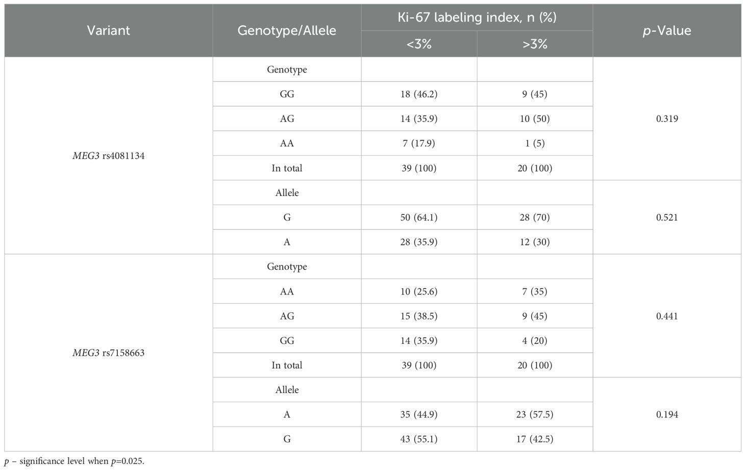 Our study investigated the relationships between MEG3 rs7158663 and rs4081134 variants, Ki-67 LI, p53 H-score, and CK18 immunohistochemical reactions with the clinicopathological features of PAs. MEG3 is an lncRNA mostly known to be involved in the regulation of p53 tumor suppressor gene expression. In recent years, both MEG3 and its genetic variants have received significant attention within the scientific field due to their potential involvement in tumorigenesis. Interestingly, the MEG3 rs7158663 variant is found to be associated with increased susceptibility to lung, colorectal, and gastric cancers. According to Wang and co-authors, MEG3 rs7158663 variant may disrupt the binding of specific miRNAs, such as hsa-miR-4307 and hsa-miR-1265, to MEG3. Such interference could impact gene regulation mechanisms and potentially contribute to cancer development (36). While these associations have been well-documented in multiple malignancies, it is important to highlight that the role of MEG3 and its variants, particularly rs7158663, has not been extensively studied in the context of PitNETs. Although the general function of MEG3 in tumor suppression is being gradually uncovered, its involvement in PitNET pathophysiology remains relatively unexplored. The study by Wang and co-authors showed that low MEG3 expression was significantly associated with larger PitNET size (>3 cm), increased invasiveness and advanced clinical stage (III-IV). Moreover, MEG3 overexpression was related to inhibition of pituitary cell proliferation and induction of apoptosis (37). A study conducted by Tang and colleagues demonstrated the tumor-suppressive role of MEG3 lncRNA, showing that mutations in the α subunit of the stimulatory G protein (GNAS) upregulate MEG3 lncRNA expression and are associated with less invasive growth hormone-secreting PitNETs (38). In our study, neither the MEG3 rs7158663 nor rs4081134 variants showed any significant associations with PitNETs. Furthermore, no associations were observed between the analyzed variants and Ki-67 LI, p53 H-score, or CK18 immunohistochemical reactions. These findings suggest that, despite the established relevance of MEG3 variants in other cancers, their role in PitNETs remains unclear and warrants further investigation.