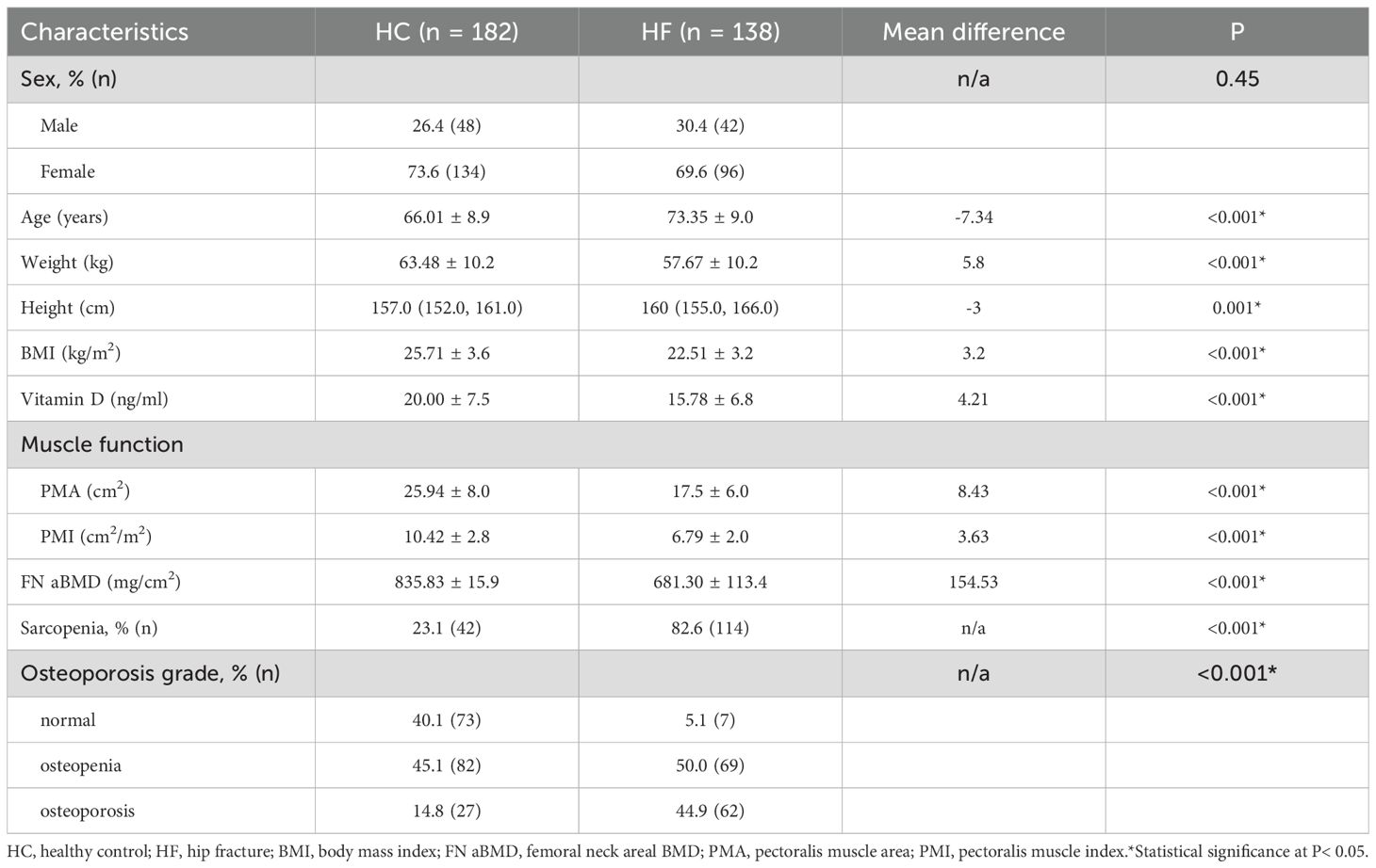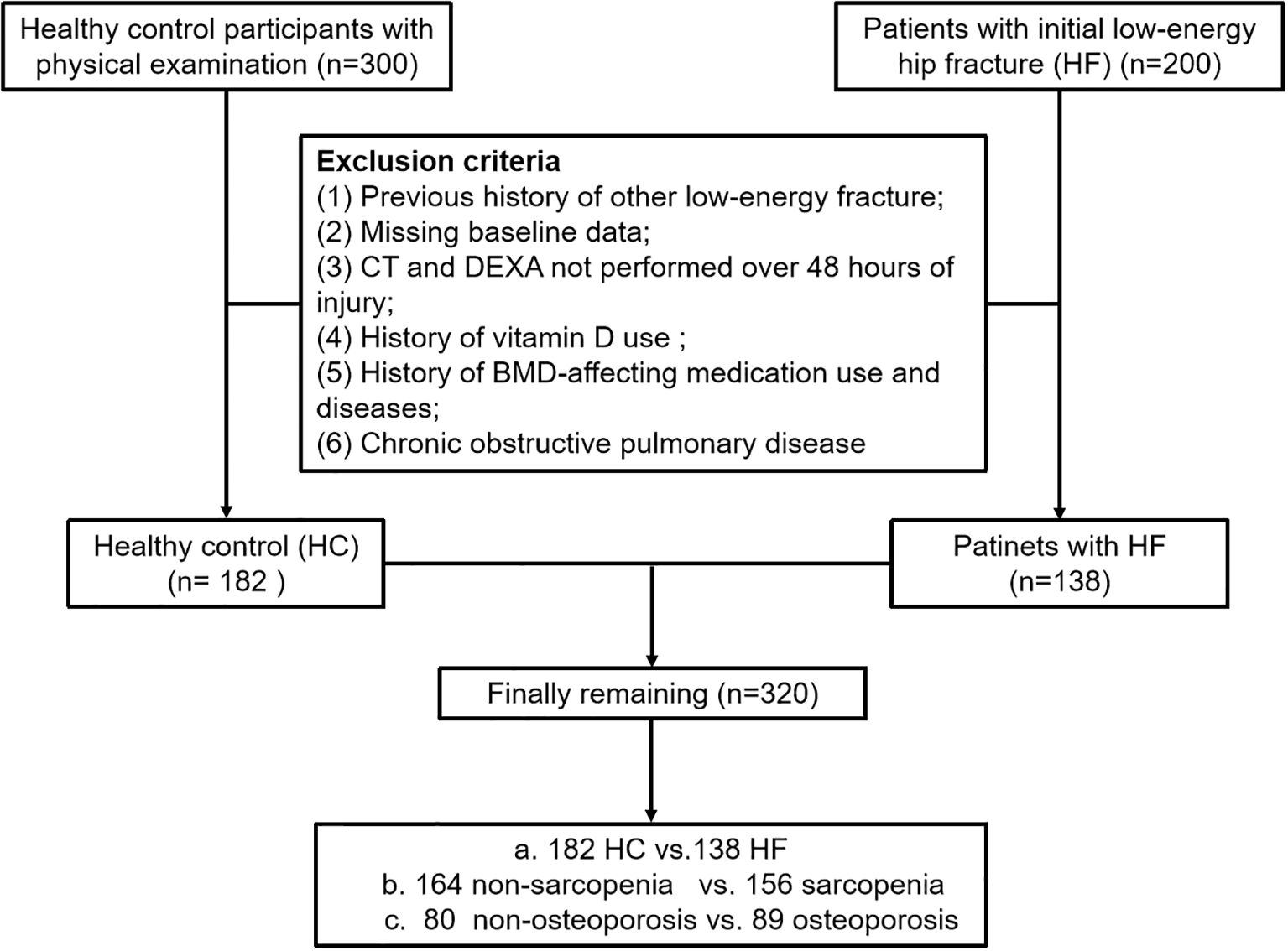 This study included 200 patients with initial low-energy hip fractures and 300 healthy control individuals. In the HF group, 62 participants were excluded: 18 with a previous history of other low-energy fracture, 11 due to missing baseline data, 10 for CT and DEXA more than 48 hours post-injury, 16 with a history of vitamin D or BMD-affecting medication use and diseases, 7 with chronic obstructive pulmonary disease. For the HC group, 118 participants were excluded. Ultimately, a total of 320 participants were included in the analysis, comprising 138 patients with HF and 182 HCs.