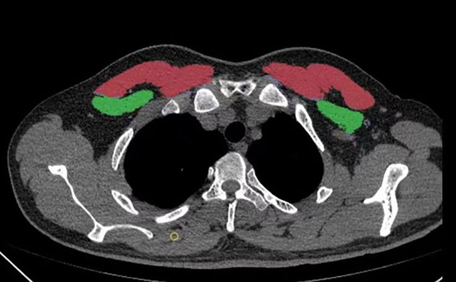 Figure 2. A method for determining pectoralis muscle area (PMA) by computed tomography (CT) with open-source software of 3D Slicer. a Horizontal plane of the T4 level; the pectoralis major is red, and the pectoralis minor is green.