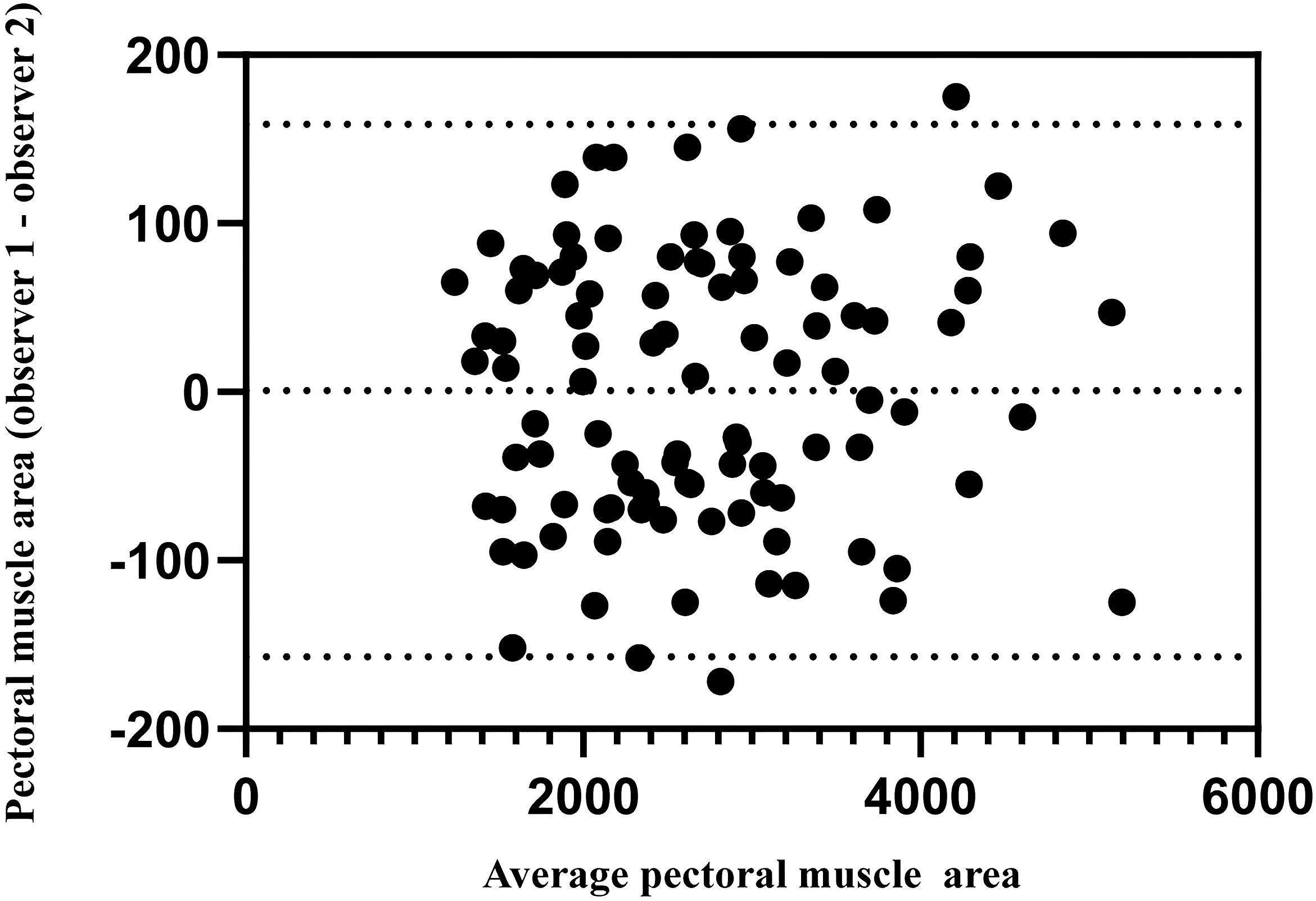 The measurements of the two observers showed good agreement (ICCPMA =0.992). Figure 3 shows the interobserver variability of PMA measurements; the 95% limits of agreement in the Bland–Altman plot between the two observers ranged from -157.2 to 158.7 mm2 for PMA (Figure 3).