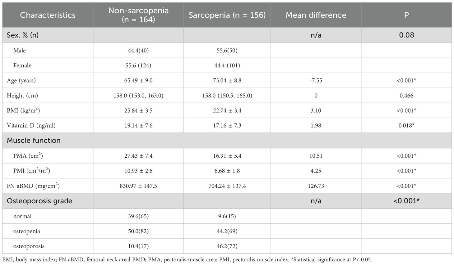 Based on BMD, participants were classified into non-osteoporosis (n = 231) and osteoporosis (n = 89) groups. Table 5 presents a comparison of their general characteristics. Osteoporosis patients were older and had lower proportions of men, BMI, PMA, and PMI (all P < 0.05). Sarcopenia prevalence was higher in the osteoporosis group. However, there was no significant difference in vitamin D levels between the osteoporosis and non-osteoporosis group (P = 0.07) (Table 5).