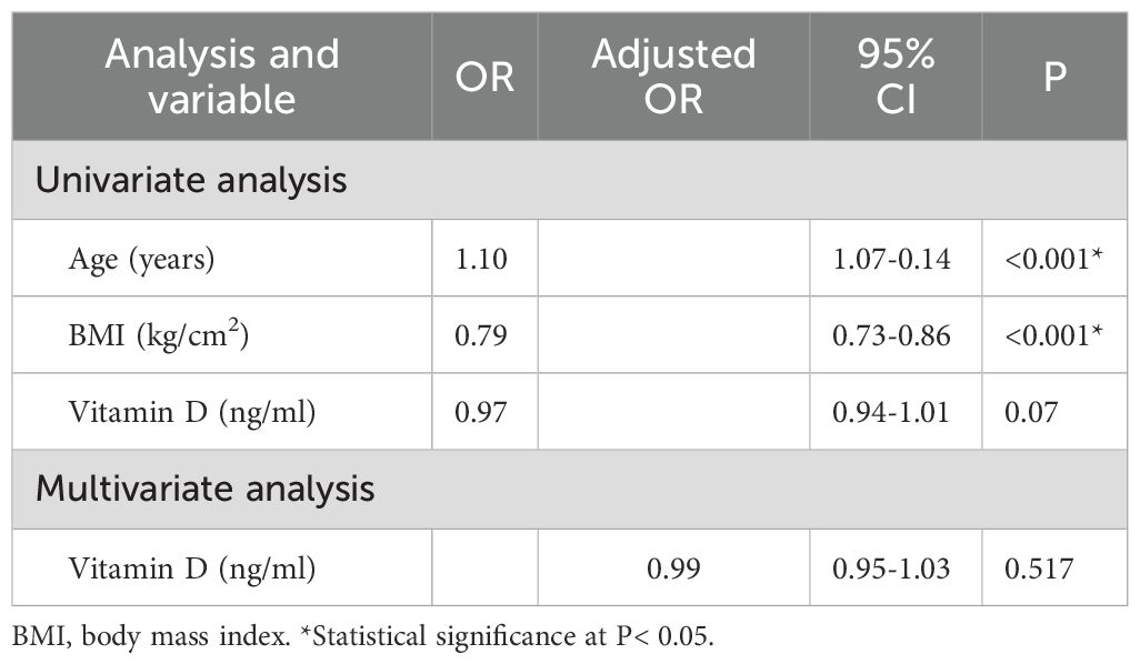 Multivariate analysis (Table 6) shows that vitamin D was not an independent predictor of osteoporosis after correcting for sex, age and BMI (P = 0.517).