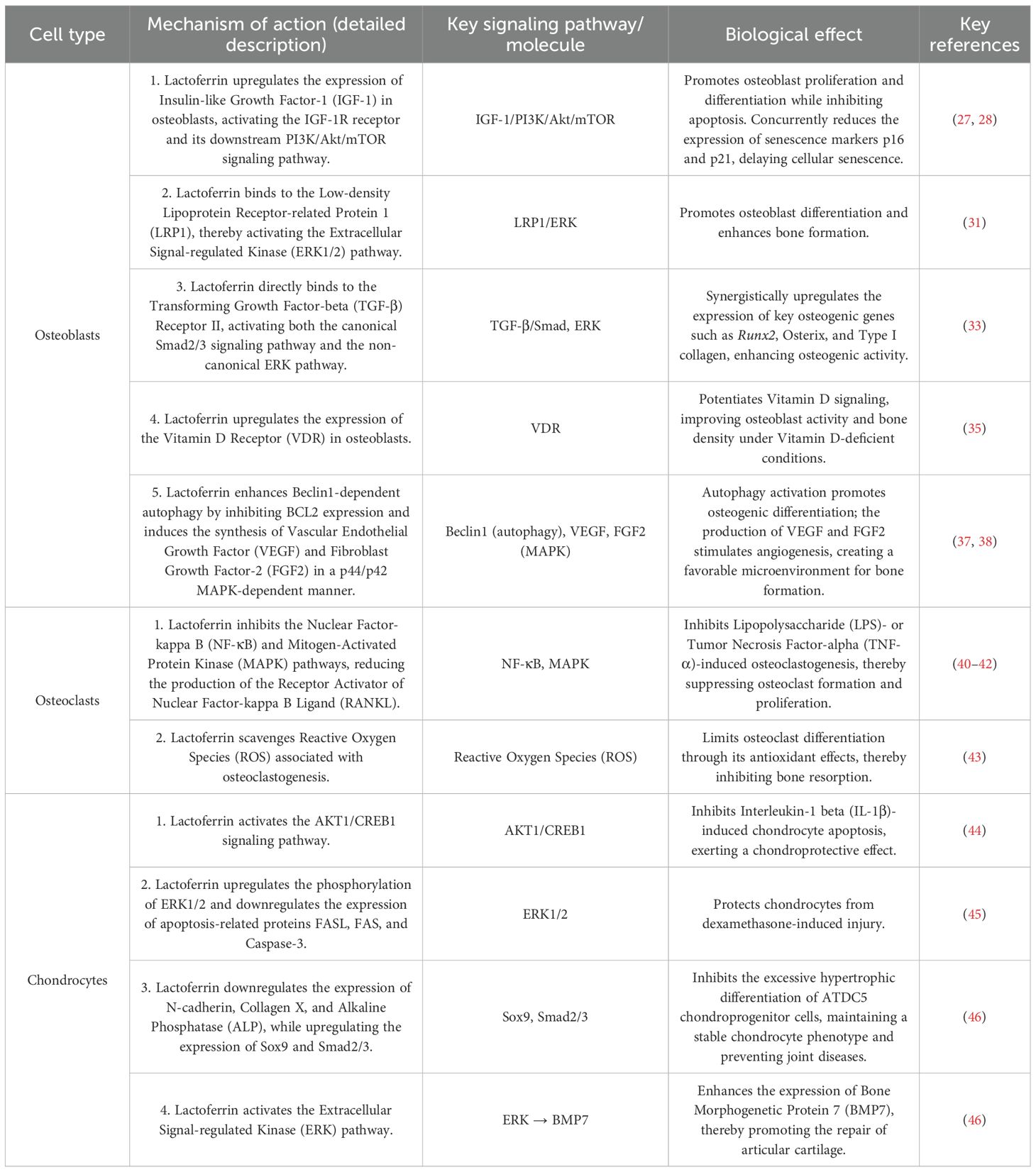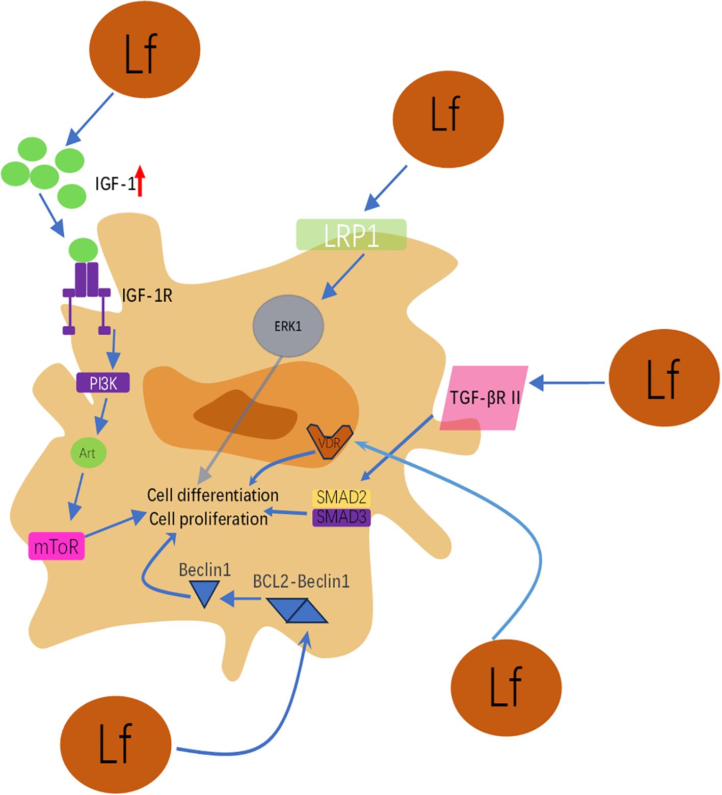 The mechanisms by which lactoferrin regulates osteoblasts are complex and varied, and although relevant studies have demonstrated that lactoferrin can play a role in promoting bone formation through the factors and signaling pathways mentioned above, deeper mechanistic studies are still the focus of subsequent research.