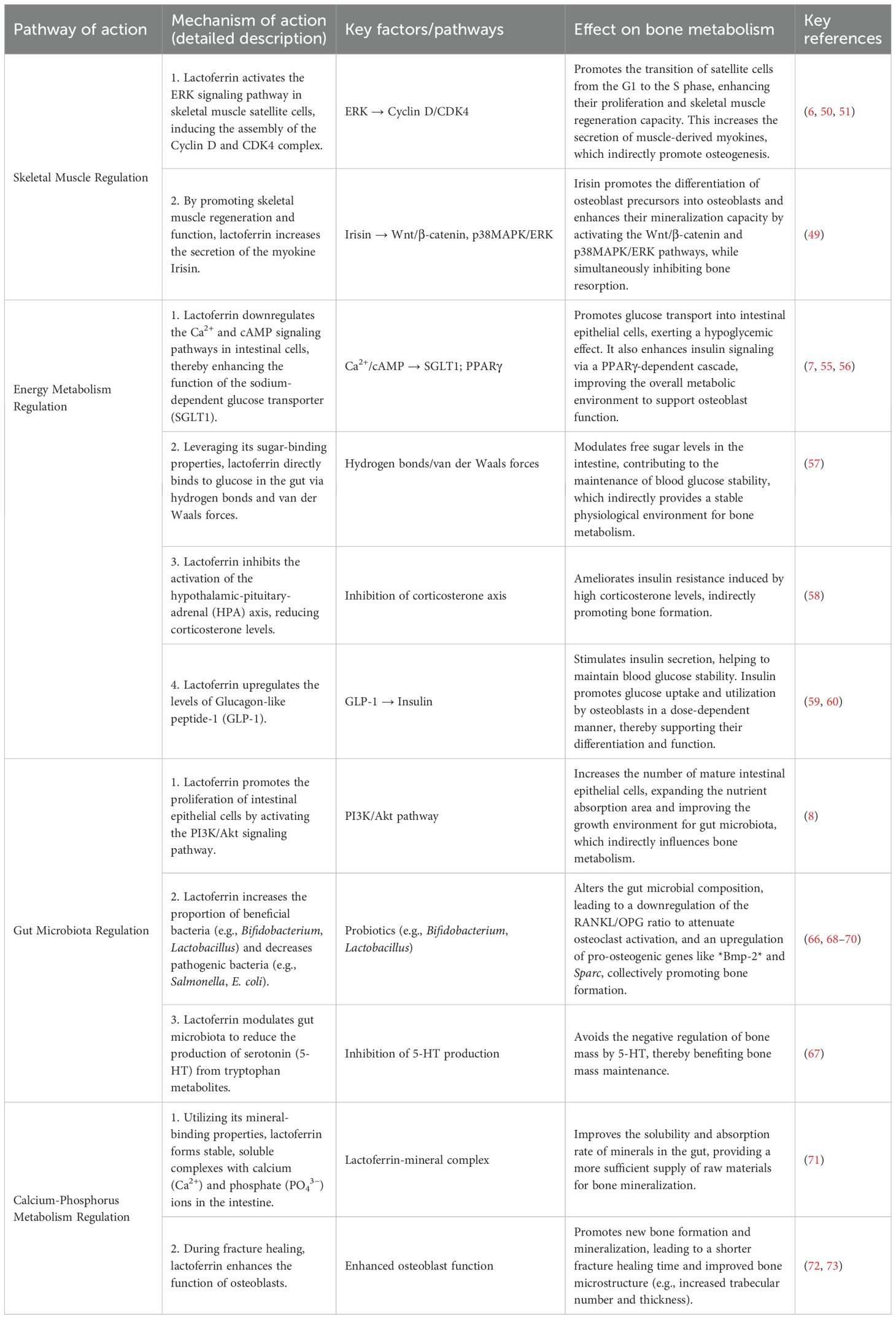 Lactoferrin has sugar-binding properties that enable it to bind to calcium and phosphorus ions in the intestine, forming a stable complex. This complex improves the solubility of minerals in the gut, thereby facilitating their absorption, a process that provides the calcium and phosphorus supply needed for bone mineralization (71). During fracture healing, lactoferrin accelerates new bone formation and mineralization by promoting osteoblast differentiation and function (72). This contributes to shorter fracture healing time and improved healing quality. Lactoferrin also improves bone microstructure, such as increasing the number and thickness of bone trabeculae and improving the connectivity and stability of bone tissue (73). This further enhances the mechanical properties of bone. The mechanism by which lactoferrin indirectly regulates bone metabolism through multiple systems is illustrated in Figure 2. The indirect regulatory mechanisms of lactoferrin on bone metabolism are summarized in Table 2.