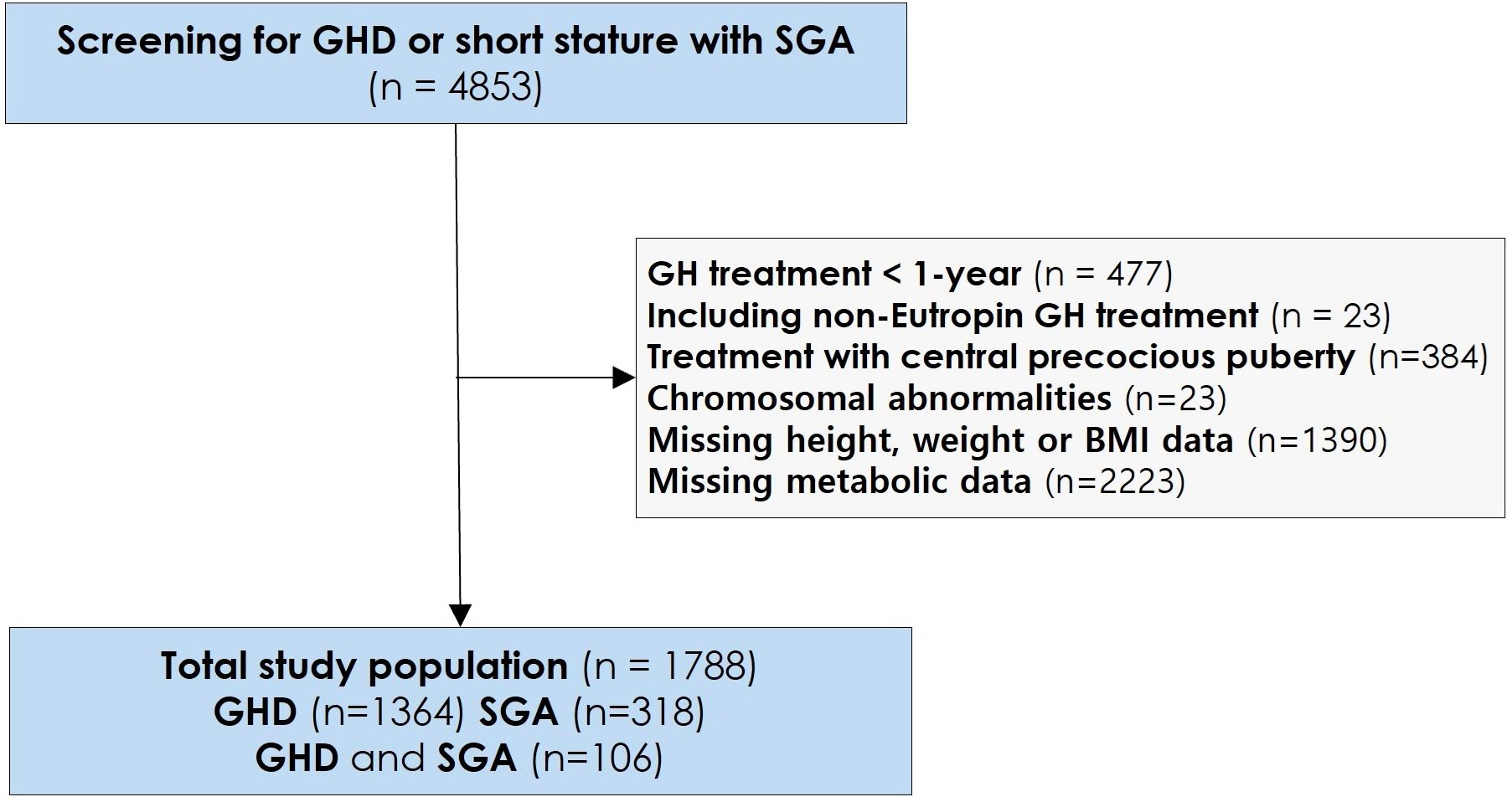 Flowchart illustrating the screening process for GHD or short stature with SGA. From 4,853 screened, exclusions included GH treatment less than one year (477), non-Eutropin treatment (23), central precocious puberty treatment (384), chromosomal abnormalities (23), missing height, weight, or BMI data (1,390), and missing metabolic data (2,223), resulting in a total study population of 1,788 consisting of GHD (1,364), SGA (318), and both GHD and SGA (106).