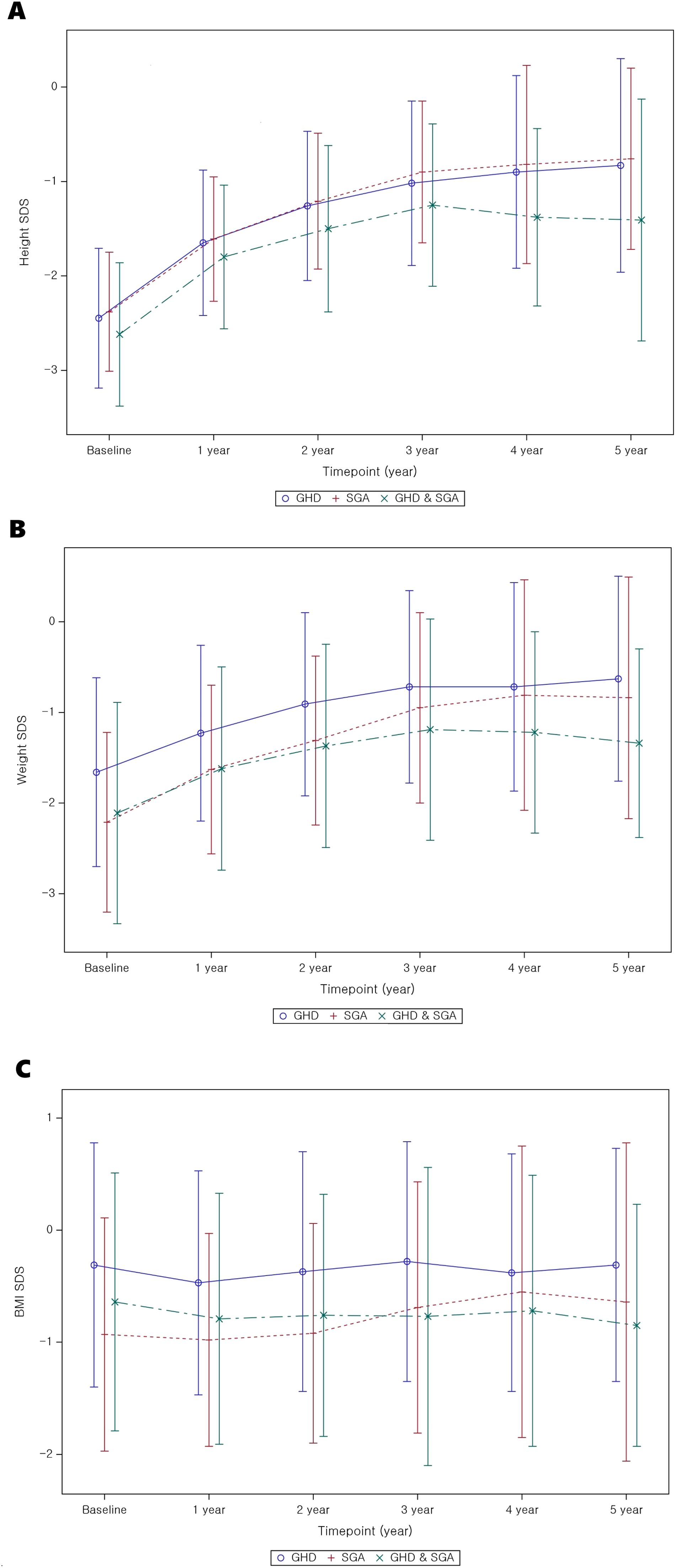 Three line graphs displaying growth metrics over five years.   A: Height SDS shows three groups: GHD, SGA, and GHD & SGA. All groups display upward trends.   B: Weight SDS similarly illustrates upward trends for the same groups over time.   C: BMI SDS trends are stable with minor fluctuations in GHD, SGA, and GHD & SGA groups. Error bars represent data variability.