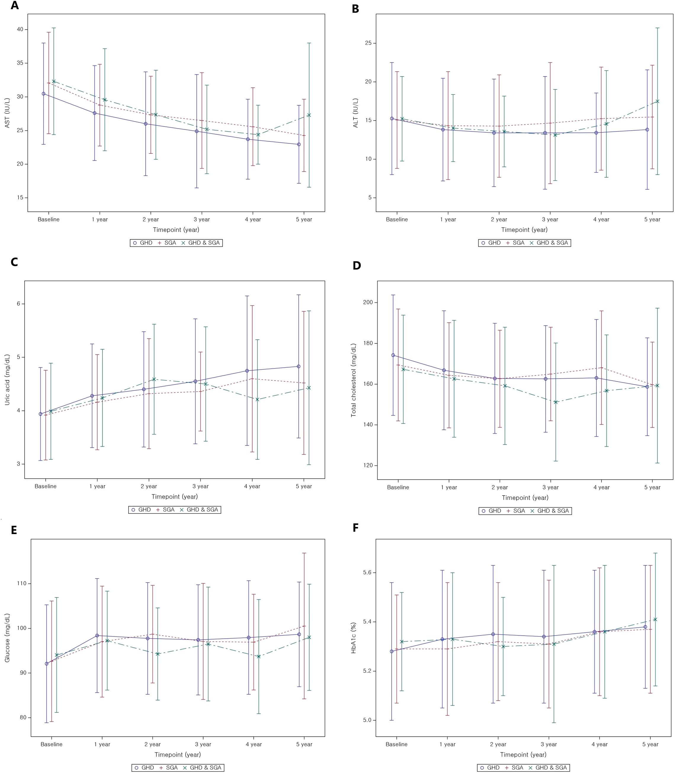 Figure 3. Metabolic parameter changes from baseline to 5 years after GH treatment. (A) AST; (B) ALT; (C) uric acid; (D) total cholesterol; (E) glucose; (F) HbA1c. GH, Growth Hormone; GHD, Growth Hormone Deficiency; SGA, Small for Gestational Age; AST, Aspartate Aminotransferase; ALT, Alanine Aminotransferase; HbA1c, Glycosylated hemoglobin.