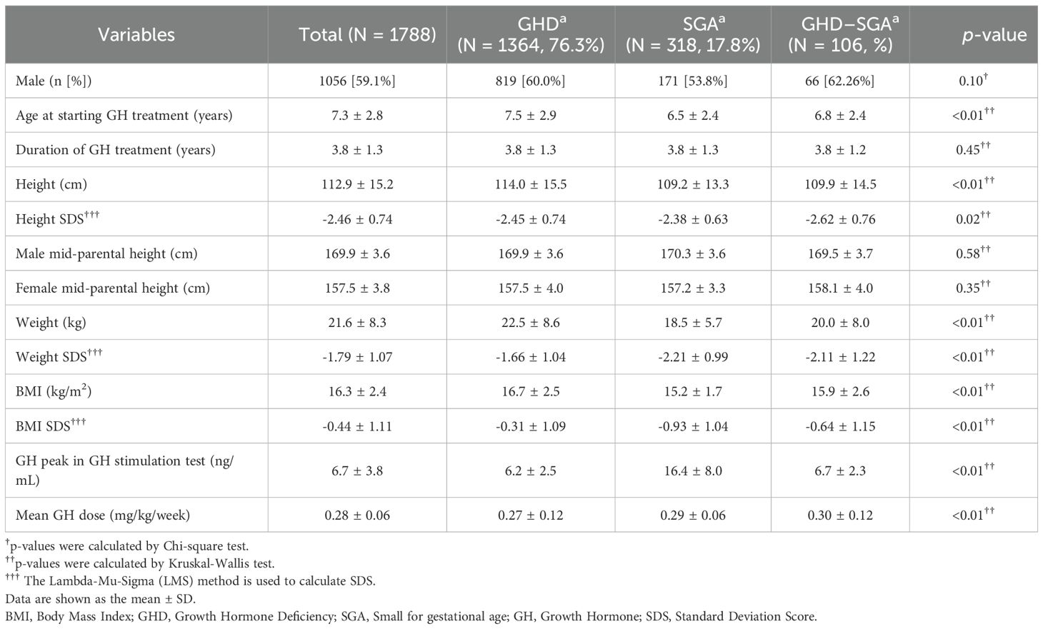 This study enrolled a total of 1,788 patients with GHD or SGA, of whom 59.1% were male. Among them, 106 patients were diagnosed with both GHD and SGA. Table 1 summarizes the baseline characteristics of the study population. The mean age at GH initiation was 7.3 ± 2.8 years. Patients with SGA began GH treatment at a younger age (6.5 ± 2.4 years) than those with GHD (7.5 ± 2.9 years, p < 0.01). The average duration of GH treatment was 3.8 ± 1.3 years. Before initiating GH treatment, the mean height SDS, weight SDS, and BMI SDS were below average, measuring -2.46 ± 0.74, -1.79 ± 1.07, and -0.44 ± 1.1, respectively. Patients with SGA had significantly lower body weight and BMI SDS than those with GHD (p < 0.01). Additionally, the mean GH peak level was 6.2 ± 2.5 ng/mL in patients with GHD and significantly higher at 16.4 ± 8.0 ng/mL in those with SGA. The mean GH treatment dose was 0.28 ± 0.06 mg/kg/week. Patients with SGA received a relatively higher dose (0.29 ± 0.06 mg/kg/week) than those with only GHD (0.27 ± 0.12 mg/kg/week, p < 0.01).