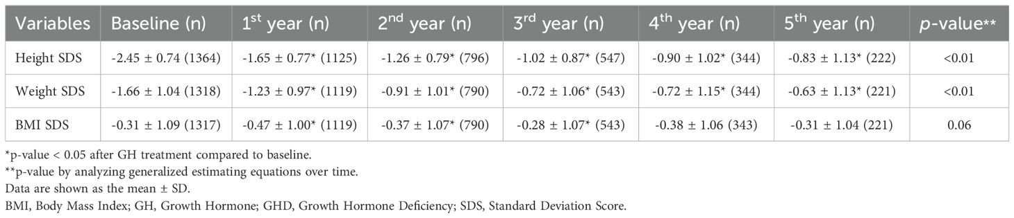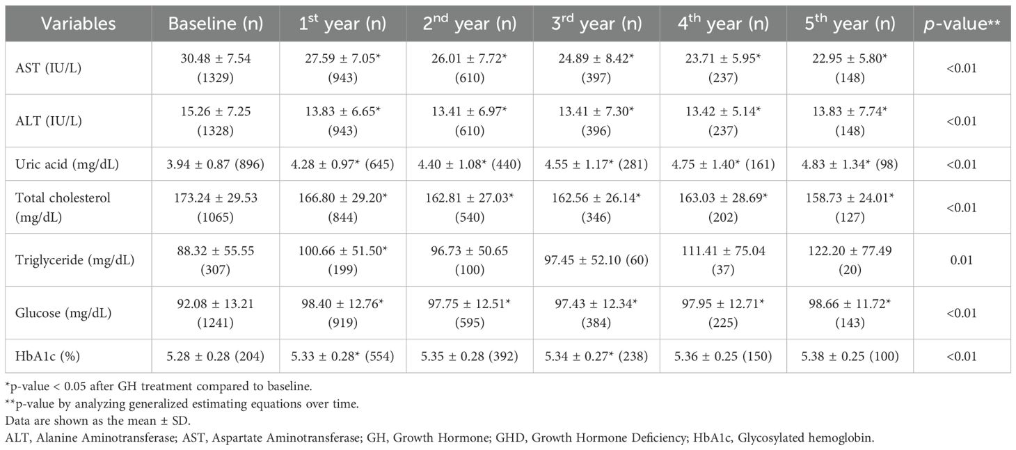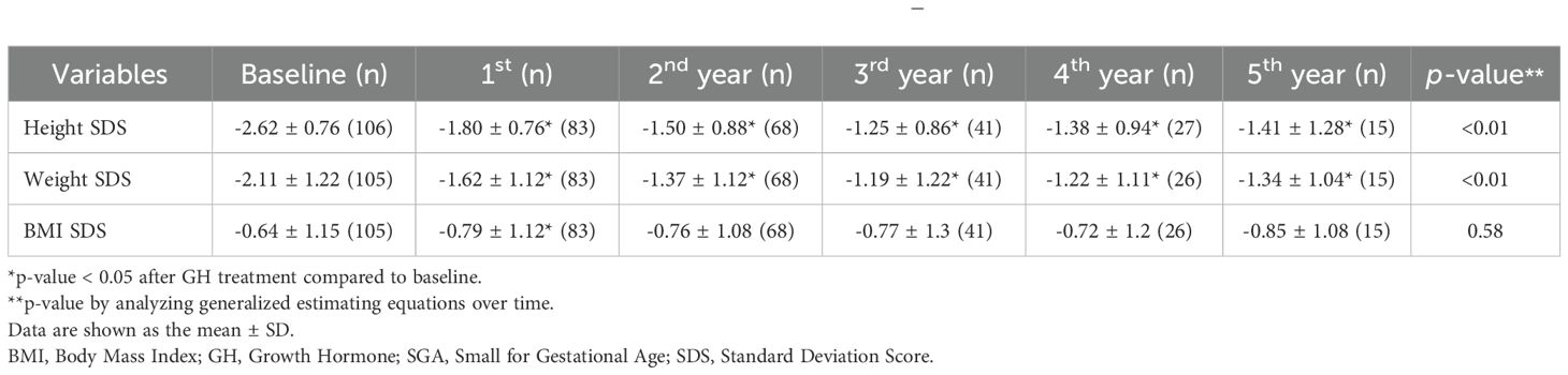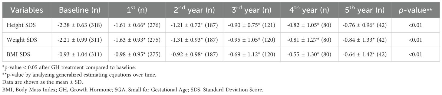 This study demonstrates that long-term GH treatment in patients with GHD and SGA is effective in improving metabolic parameters, particularly BMI, hepatic indices, and lipid profiles, over a 5-year follow-up period and also promotes linear growth. Our findings align with those of previous studies (19, 20), indicating that GH treatment leads to a substantial increase in height SDS in both groups, with a more pronounced response over time in patients experiencing hormone deficiencies or restricted fetal development. The greatest height SDS increase occurred in the first year of treatment, reaching 0.78 ± 0.38 (GHD: 0.78 ± 0.37; SGA: 0.79 ± 0.31; GHD and SGA: 0.80 ± 0.44), which is consistent with the results of previous studies reporting a first-year increment of 0.72 SDS. After 5 years of treatment, the total height SDS gain was 1.78 ± 0.94, 1.94 ± 0.82, and 1.64 ± 0.85 in the GHD, SGA, and GHD and SGA groups, aligning with the findings of other long-term observational cohort studies. For example, the Kabi/Pfizer International Growth Database (KIGS) cohort study (21, 22) reported median near-adult height (NAH)-SDS gains of 1.79 in boys and 2.07 in girls with idiopathic GHD. In the SGA group, the reported gains were 1.34 and 1.57 in boys and girls, respectively. However, in this study, the greater height gain observed in the SGA group after 5 years may be partly explained by the smaller number of patients who completed the full 5-year follow-up in this subgroup.