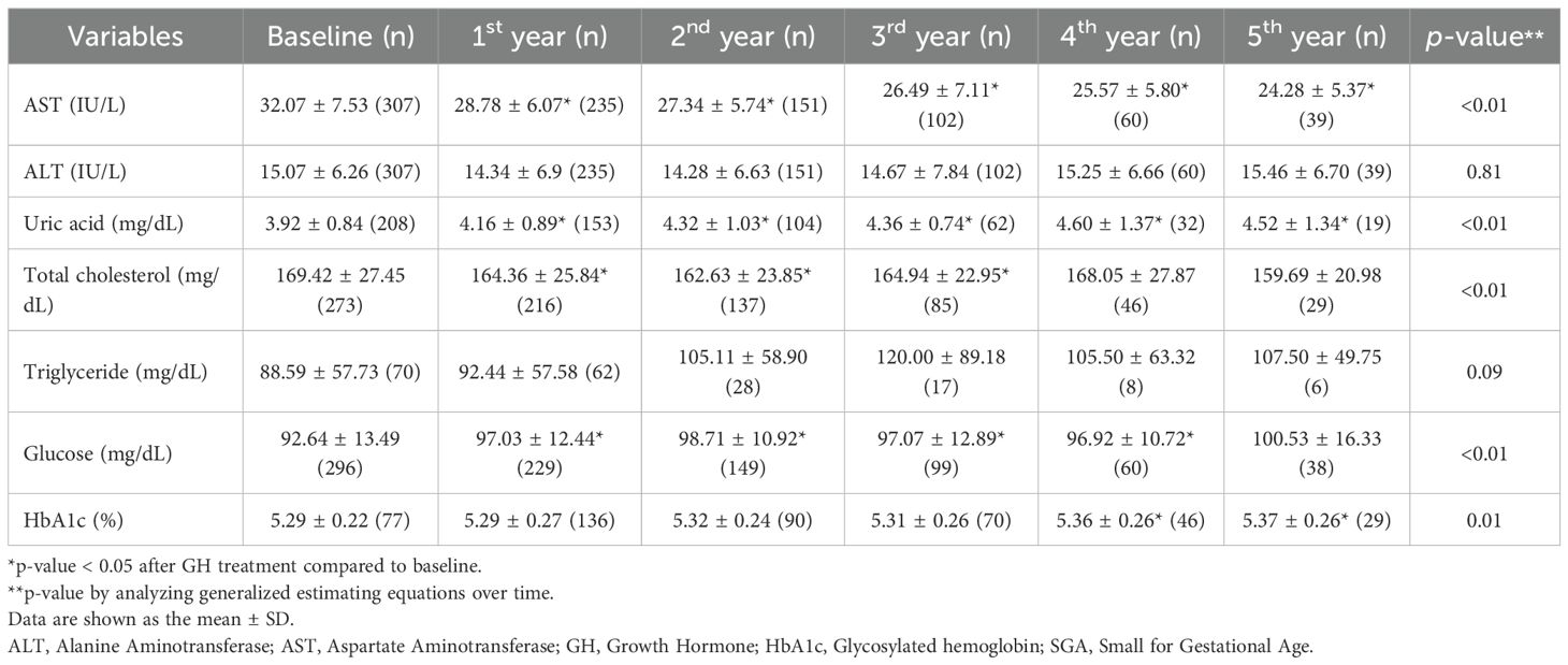 In patients with GHD and SGA, AST levels significantly improved relative to baseline values after the initiation of GH treatment (all, p < 0.01). Uric acid concentrations significantly increased during the first, second, and third years of treatment (all p < 0.01), while total cholesterol levels significantly declined in years 2 and 3. Conversely, fasting glucose levels increased significantly only during the first year of therapy. GEE modeling demonstrated a significant time-dependent decrease in AST and total cholesterol levels (both, p < 0.01), alongside a significant time-dependent increase in uric acid levels (p < 0.01).