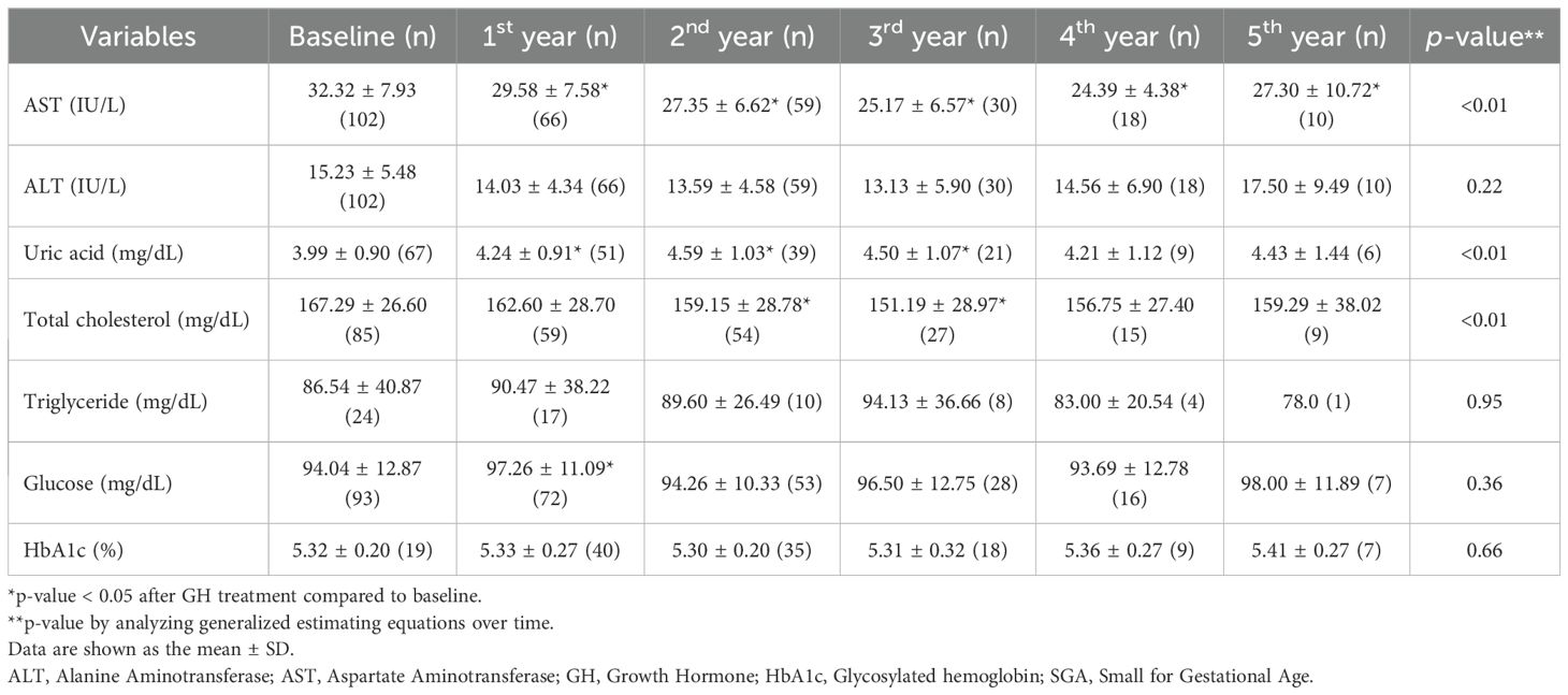 The pattern of metabolic parameter changes in the SGA group was similar to that observed in the GHD group. AST and ALT levels significantly decreased to within the normal range. Uric acid levels demonstrated a continuous increase throughout the treatment period but remained within the normal range (p < 0.01 in the first, second, third, and fourth years; p = 0.02 in the fifth year). Total cholesterol levels significantly decreased over the 5-year treatment period compared to baseline (p < 0.01 for all years), whereas TG levels did not exhibit significant changes. Conversely, glucose levels exhibited the most pronounced increase in the first year of GH treatment (p < 0.01), followed by a relatively stable pattern thereafter. However, HbA1c levels did not significantly change before and after GH treatment, although GEE analysis indicated a slight increase (p < 0.01), with values remaining within the normal range.