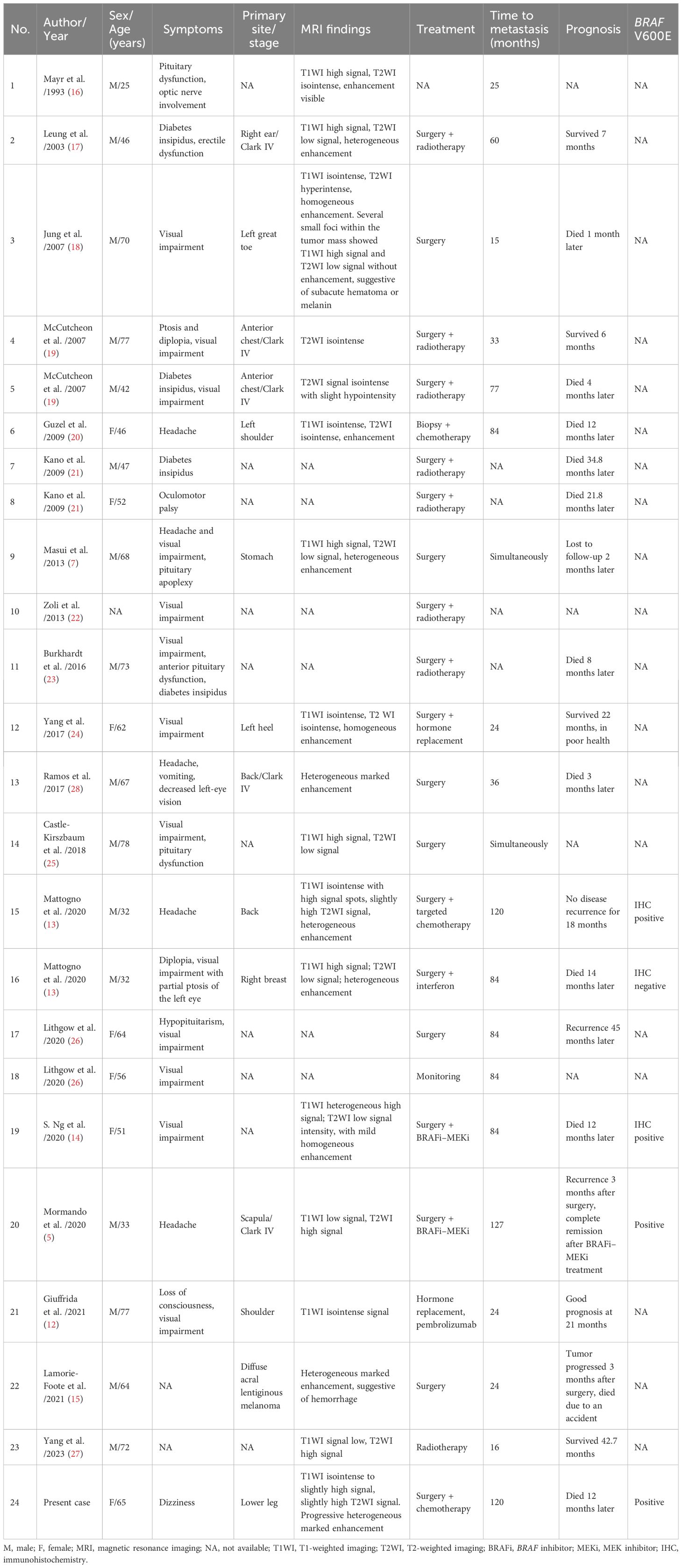 Methods: We screened all published case reports and case series on pituitary metastatic MM using PubMed, focusing on cases with detailed clinical data, imaging features, pathological examination, and molecular test results. A total of 24 cases of MM with pituitary metastasis, including our case, were retrospectively analyzed. Additionally, the index patient underwent histopathological, immunohistochemical (S100, SOX10, Melan-A, HMB-45, BRAF V600E), and BRAF V600E PCR analyses.