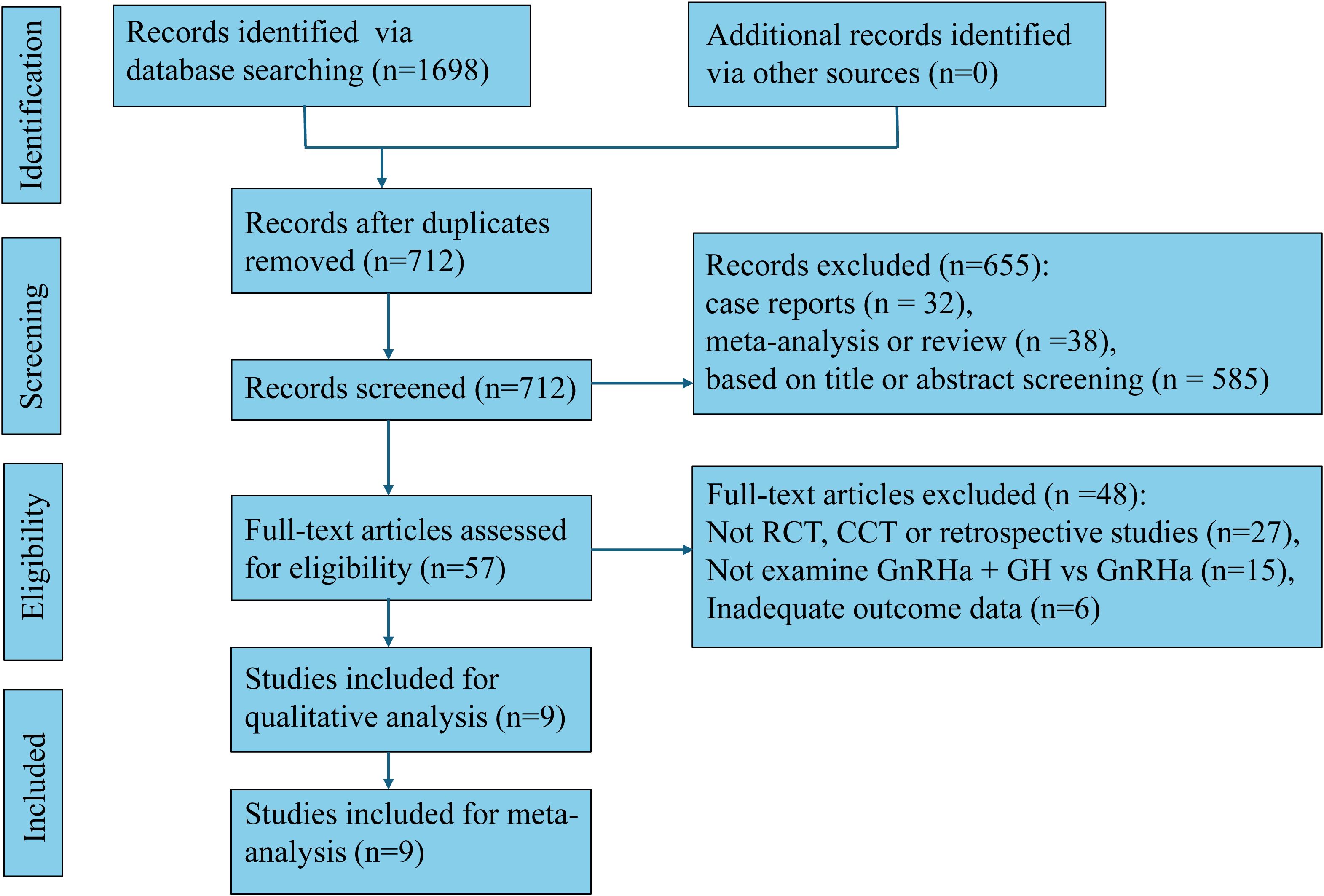 A total of 1,698 records were identified through systematic database searching for studies comparing the efficacy of GnRHa combined with GH versus GnRHa alone in girls with CPP. No additional studies were found through other sources. After removing duplicates, 712 unique records were screened by title and abstract, resulting in the exclusion of 655 articles due to being case reports (n=32), meta-analyses or reviews (n=38), or irrelevant based on title or abstract (n=585). The remaining 57 articles were retrieved for full-text assessment, of which 48 were excluded for not being RCTs, case-control trials (CCTs), or retrospective studies (n=27), for not comparing the appropriate interventions (n=15), or for having inadequate outcome data (n=6). Ultimately, 9 studies fulfilled all inclusion criteria and were incorporated into both the qualitative synthesis and the final meta-analysis (Figure 1).
