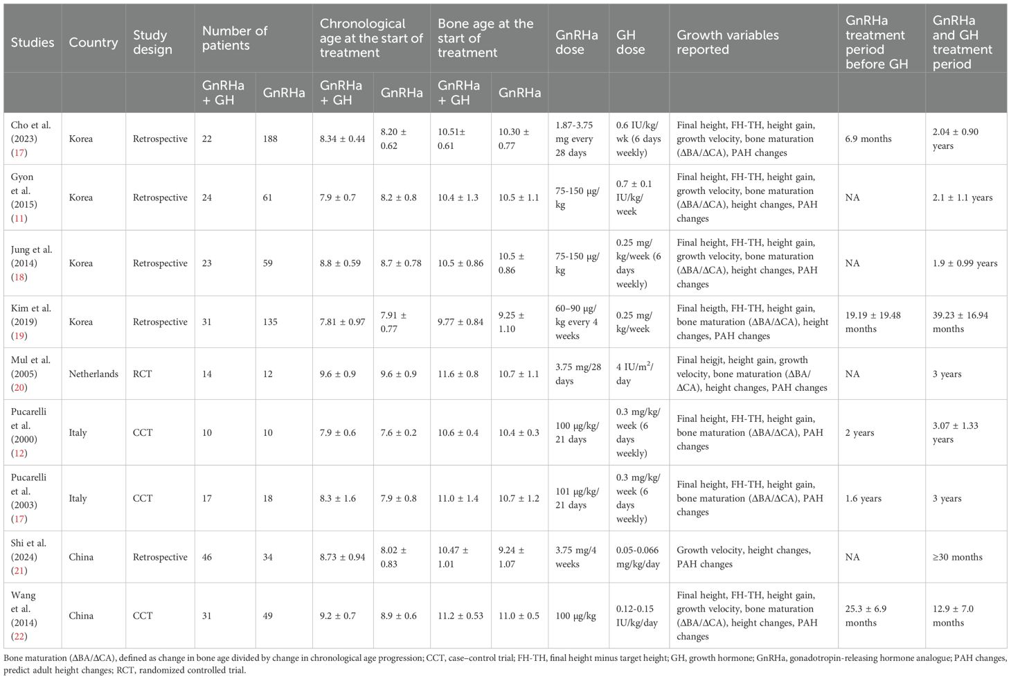 To address these limitations, the addition of growth hormone (GH) to GnRHa has been explored as a strategy to augment height potential during treatment. GH promotes longitudinal bone growth through stimulation of insulin-like growth factor-1 (IGF-1) and can potentially offset the deceleration in growth velocity commonly observed during GnRHa-induced pubertal suppression (8, 9). Several clinical studies and observational cohorts have investigated this combination approach, suggesting variable degrees of benefit in terms of final height, predicted adult height (PAH), height gain, and growth velocity (1012). However, the interpretation of these results remains complex due to heterogeneity in baseline characteristics, treatment regimens, and outcome definitions.