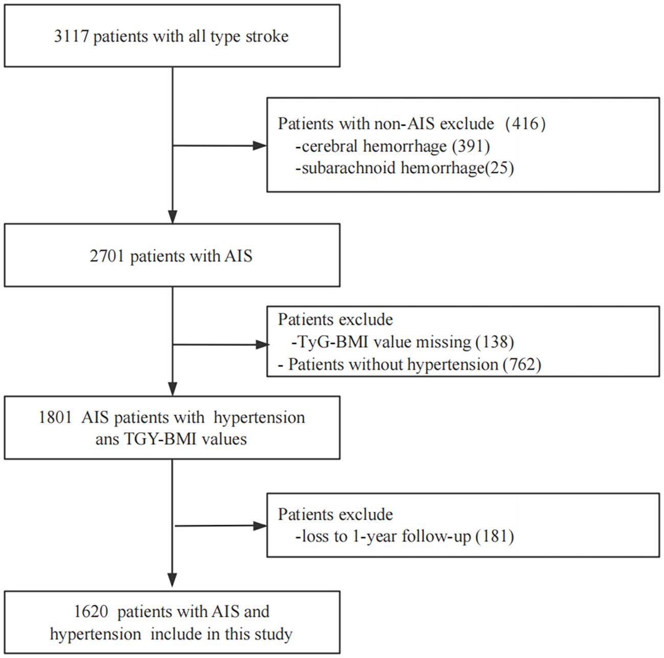 This was a multicenter, retrospective, observational cohort study. The study population comprised patients with stroke hospitalized between January and December 2015 at four tertiary Grade-A hospitals in Xi’an, China. At study initiation, 3,117 enrolled stroke patients received comprehensive clinical assessments and were followed longitudinally at 1, 3, 6, and 12 months following symptom onset. Inclusion criteria comprised (1): clinical diagnosis of AIS and hypertension; (2) brain computed tomography or cranial magnetic resonance findings meeting American Heart Association/American Stroke Association diagnostic criteria (25); (3) aged ≥ 18 years; and (4) symptom onset ≤ 7 days before study entry. Individuals were excluded for: (1) patients with cerebral hemorrhage or subarachnoid hemorrhage; (2) TyG-BMI values missing; (3) patients without hypertension; and (4) loss to 1-year follow-up. The screening workflow and study enrollment are illustrated in Figure 1. Consistent diagnostic criteria were applied across all participating hospitals.