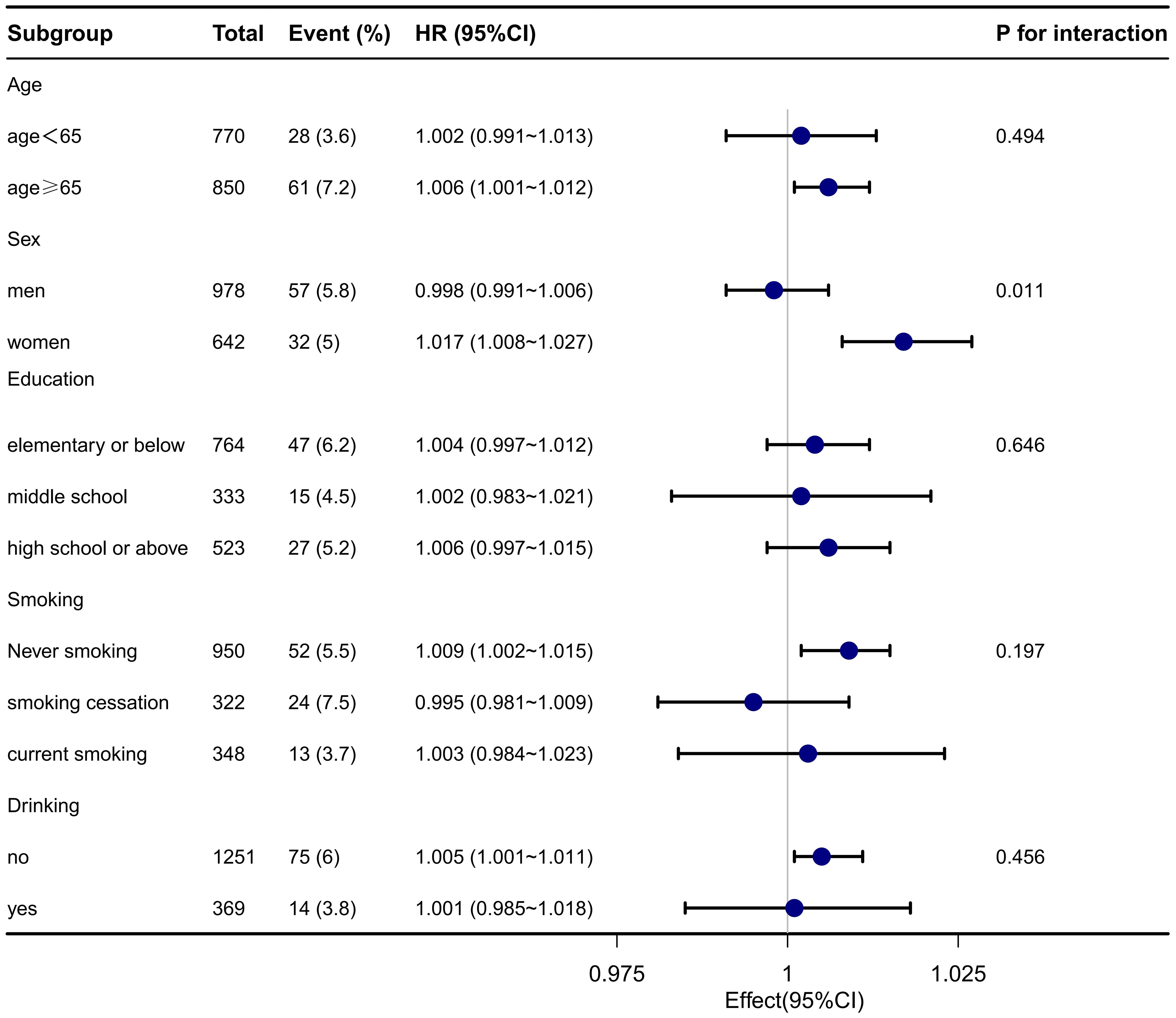 Stratified and interaction analyses were conducted to assess the association between elevated TyG-BMI and the 1-year stroke recurrence risk across various clinically relevant subgroups in patients with AIS and hypertension. The results are presented in Figure 2. Significant interactions were found for sex (P for interaction = 0.011), suggesting that the impact of TyG-BMI on stroke recurrence risk may differ across this subgroup. No significant interactions were detected for age, educational level, drinking, and smoking status (all P > 0.05).