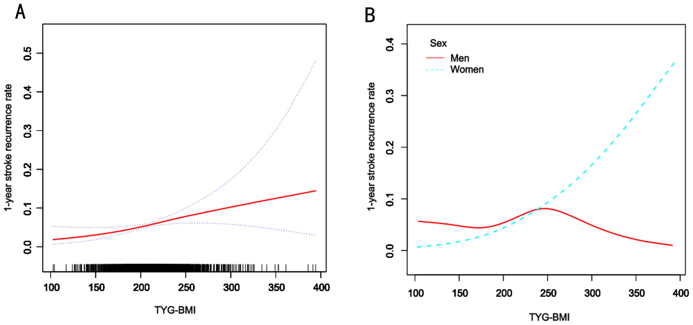Figure 3. Smooth curve fitting of TyG-BMI to the risk of 1-year risk of stroke recurrence. A, Smooth curve fitting analysis of the relationship between TyG-BMI and 1-year stroke recurrence risk in all patients and the red line represents the overall trend, the blue dashed line indicates the confidence interval, and the black short lines on the horizontal axis represent the TyG-BMI distribution density. B, Smooth curve fitting analysis stratified by sex. The blue line represents women, and the red line represents men.