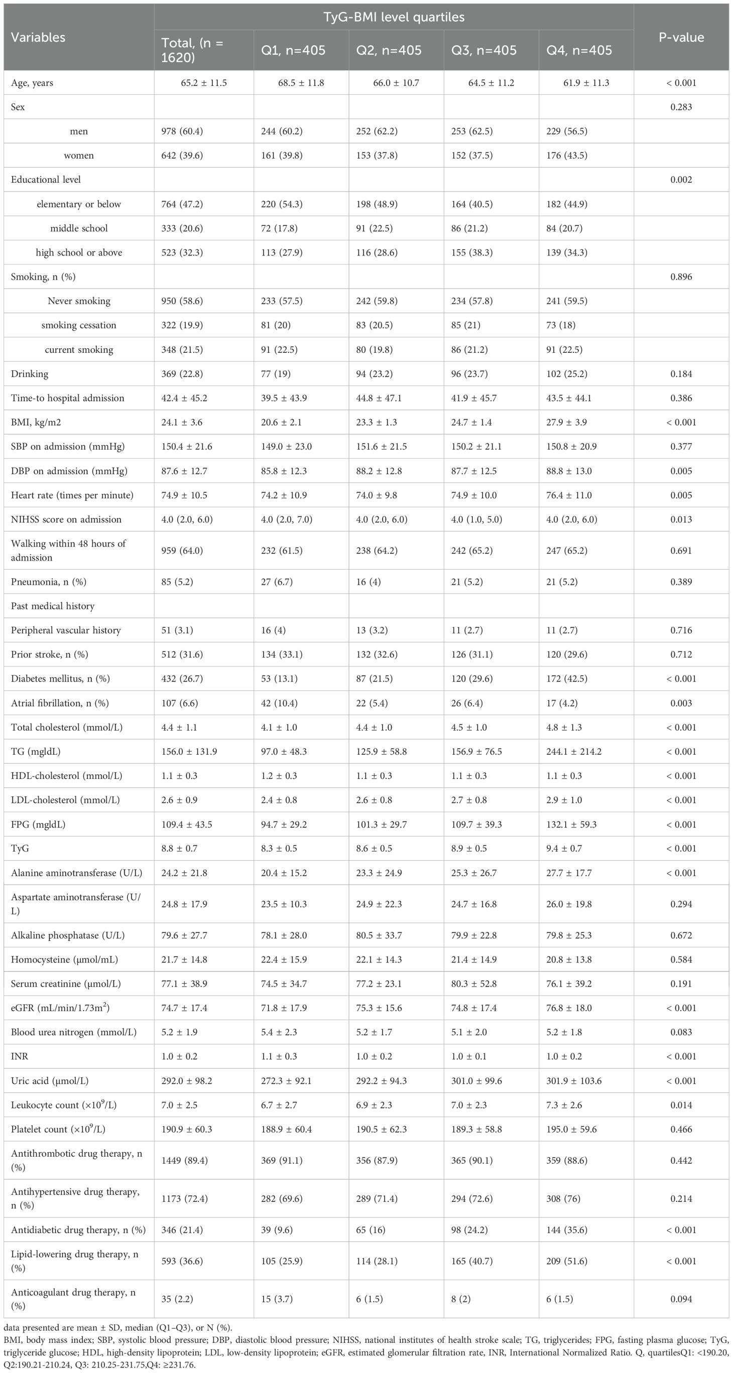 This study utilized data from the Xi’an Stroke Registry. Baseline information was collected, including sociodemographic details (age, sex, educational level), medical history (smoking, drinking, pneumonia, peripheral vascular disease, prior stroke, diabetes mellitus, and atrial fibrillation), admission assessments (systolic blood pressure [SBP] on admission, diastolic blood pressure [DBP] on admission, heart rate, National Institutes of Health Stroke Scale [NIHSS] score on admission, walking within 48 h of admission), BMI, and key laboratory results (total cholesterol, TG, high-density lipoprotein [HDL] cholesterol, low-density lipoprotein [LDL] cholesterol, FPG, alanine aminotransferase, aspartate aminotransferase, alkaline phosphatase, homocysteine, serum creatinine, blood urea nitrogen, and uric acid levels; estimated glomerular filtration rate [eGFR]; international normalized ratio [INR]; leukocyte count; and platelet count). Definitions for medical history, risk factors, and study parameters were aligned with the China National Stroke Registry (CNSR) protocol (26). TyG-BMI was analyzed both as a continuous measure and categorized into quartiles (Q1–Q4). The participants were divided into quartiles based on their TyG-BMI index, using the following cutoff points: 190.20, 210.24, and 231.75. Thus, the quartiles (Q1-Q4) were defined as Q1: <190.20, Q2: 190.20–210.24, Q3: 210.24–231.75, and Q4: ≥231.76.